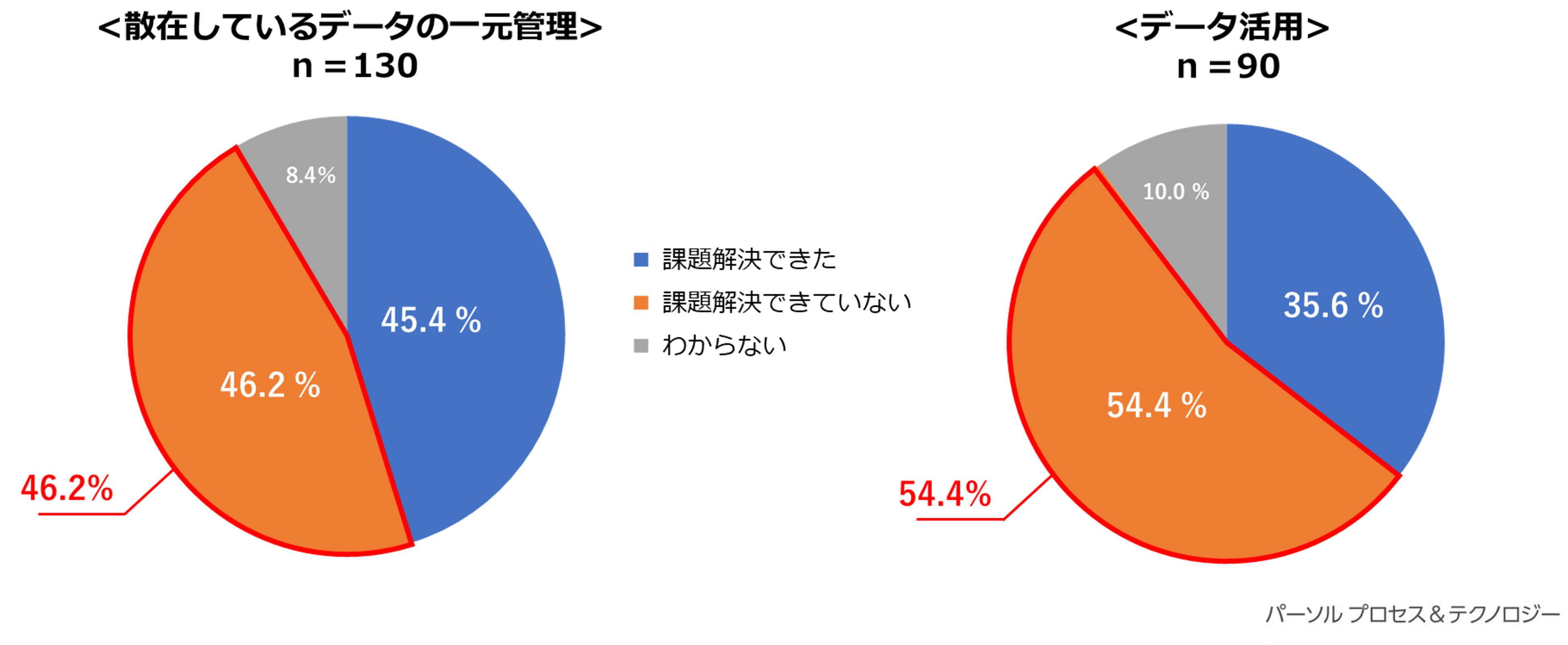一方で、解決できなかった課題は「散財しているデータの一元管理」「データ活用」という結果に。