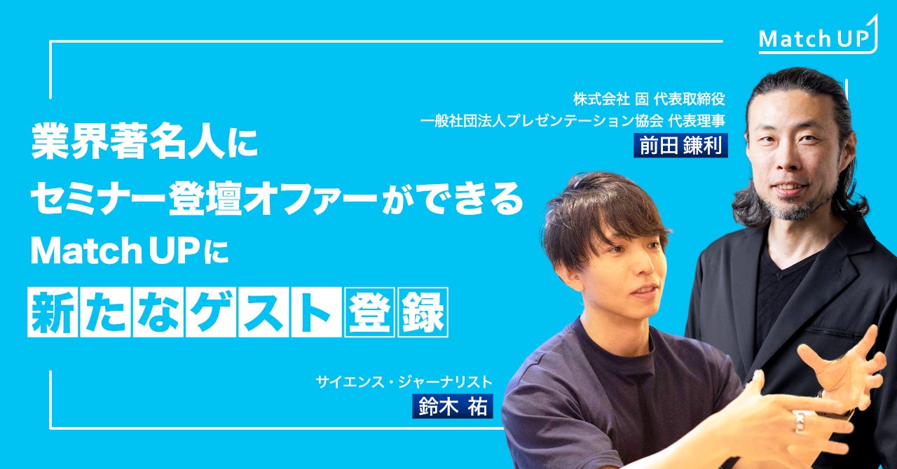 業界著名人にセミナー/イベント登壇のオファーができる「Match UP」 サイエンス・ジャーナリストの鈴木祐氏、株式会社 固 代表取締役の前田鎌利氏などが新たにゲスト登録!