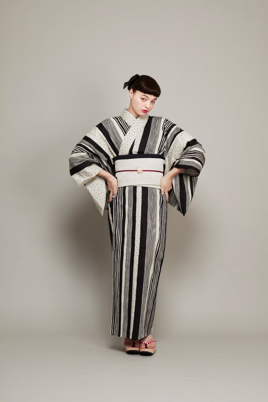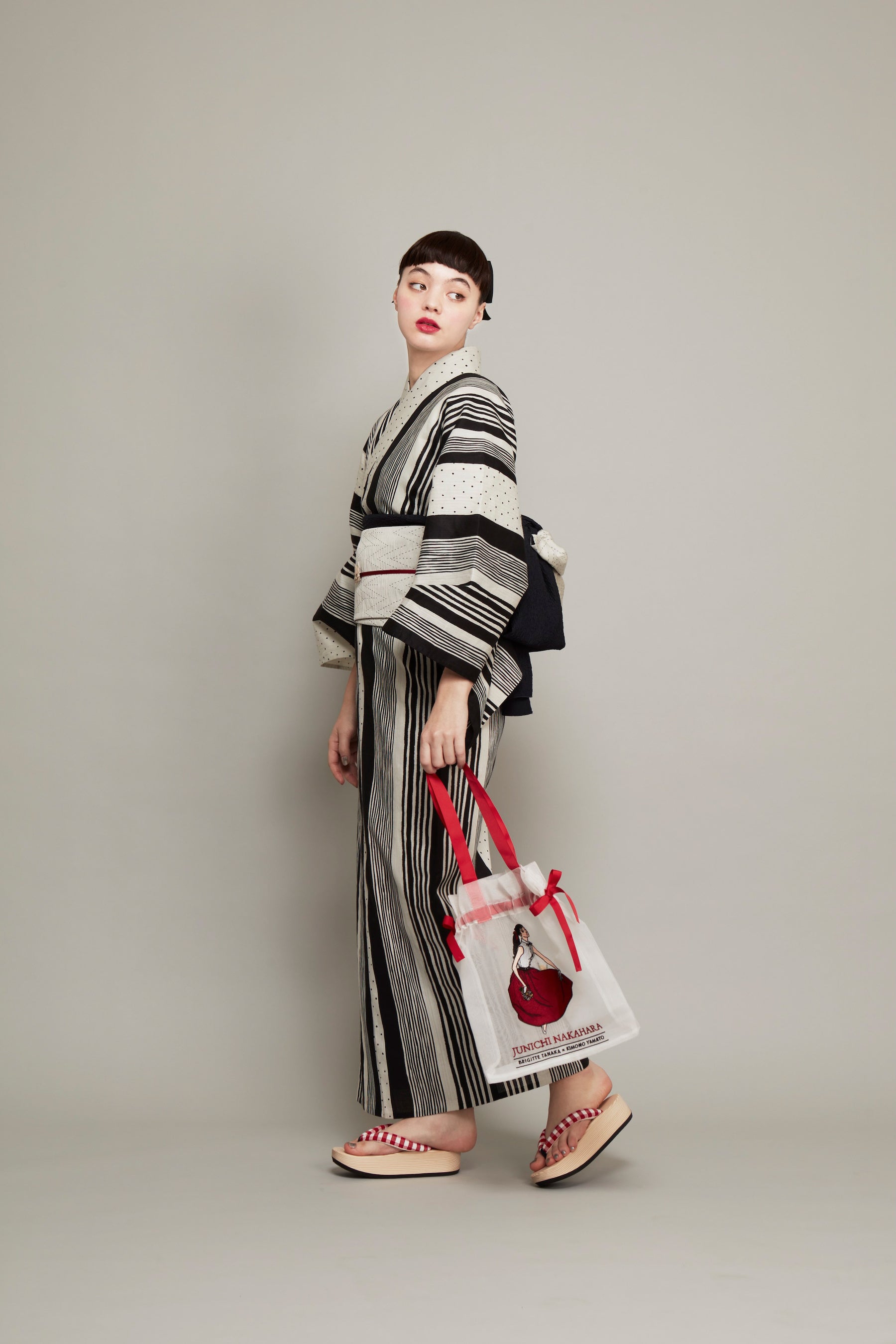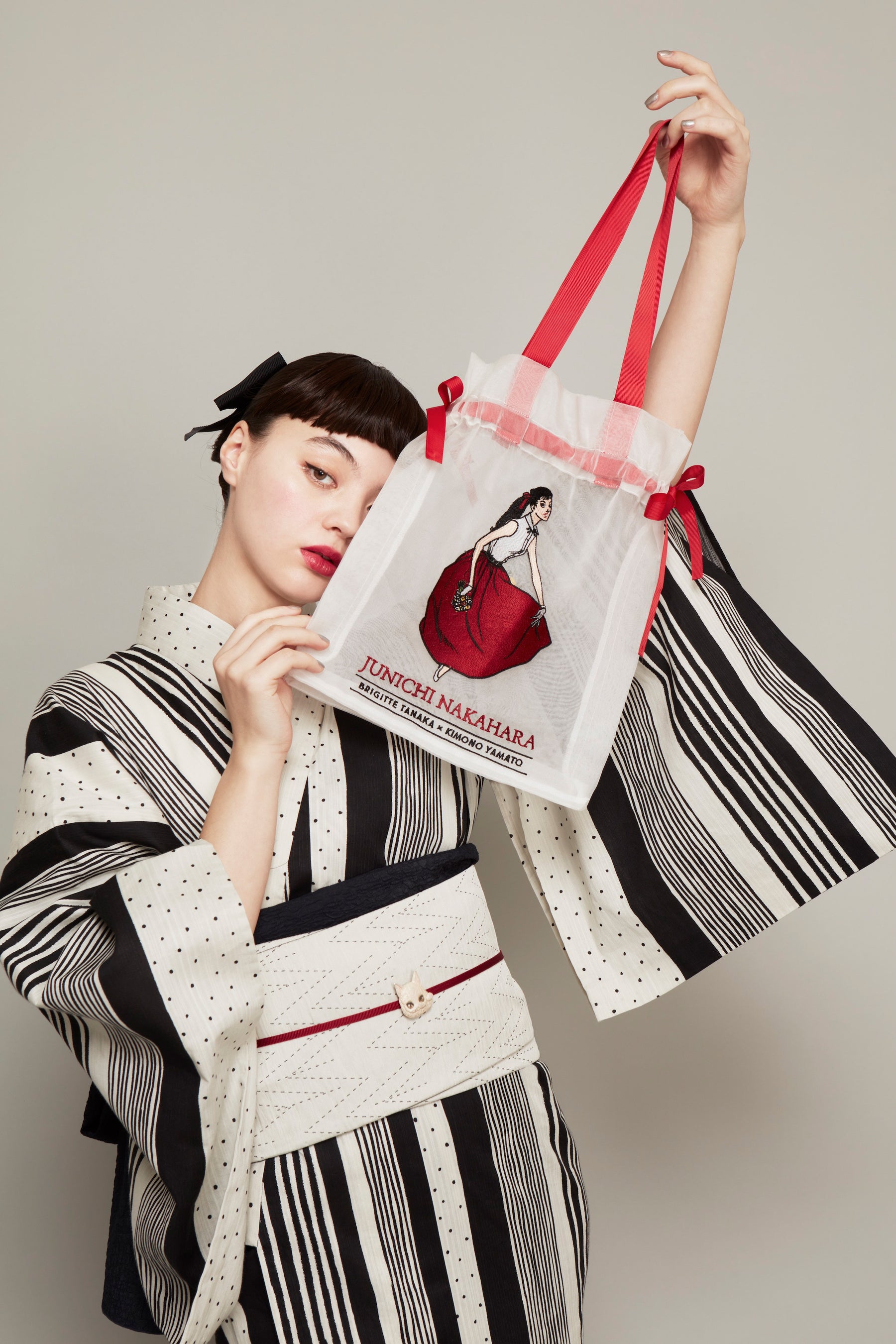 中原淳一が描いた雑誌の挿絵をもとに、ドットとストライプを掛け合わせたデザイン。ビジュアルでは、衣紋を詰め、ウエストを際立たせた原画の着こなしをもとにした対丈スタイルを再現しています。
