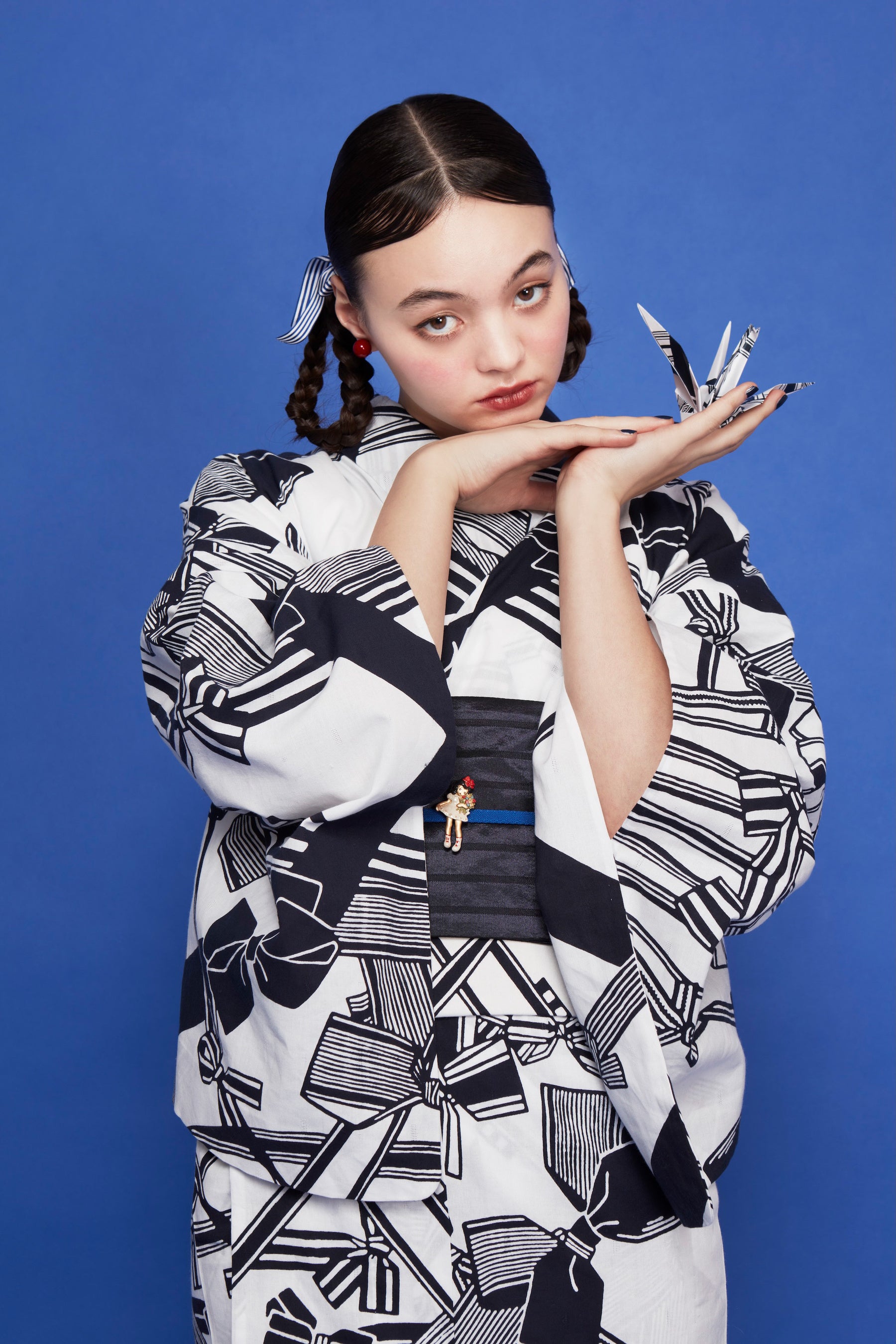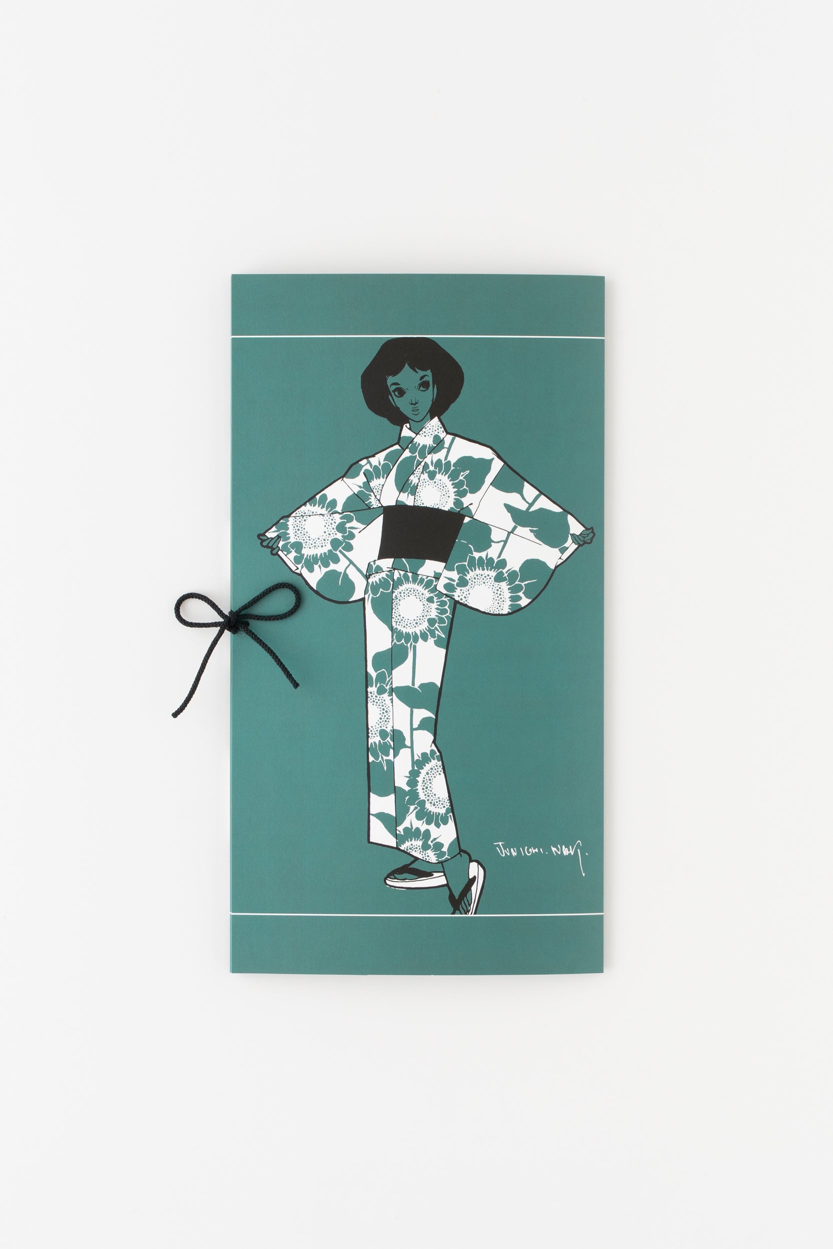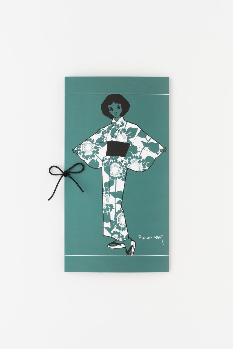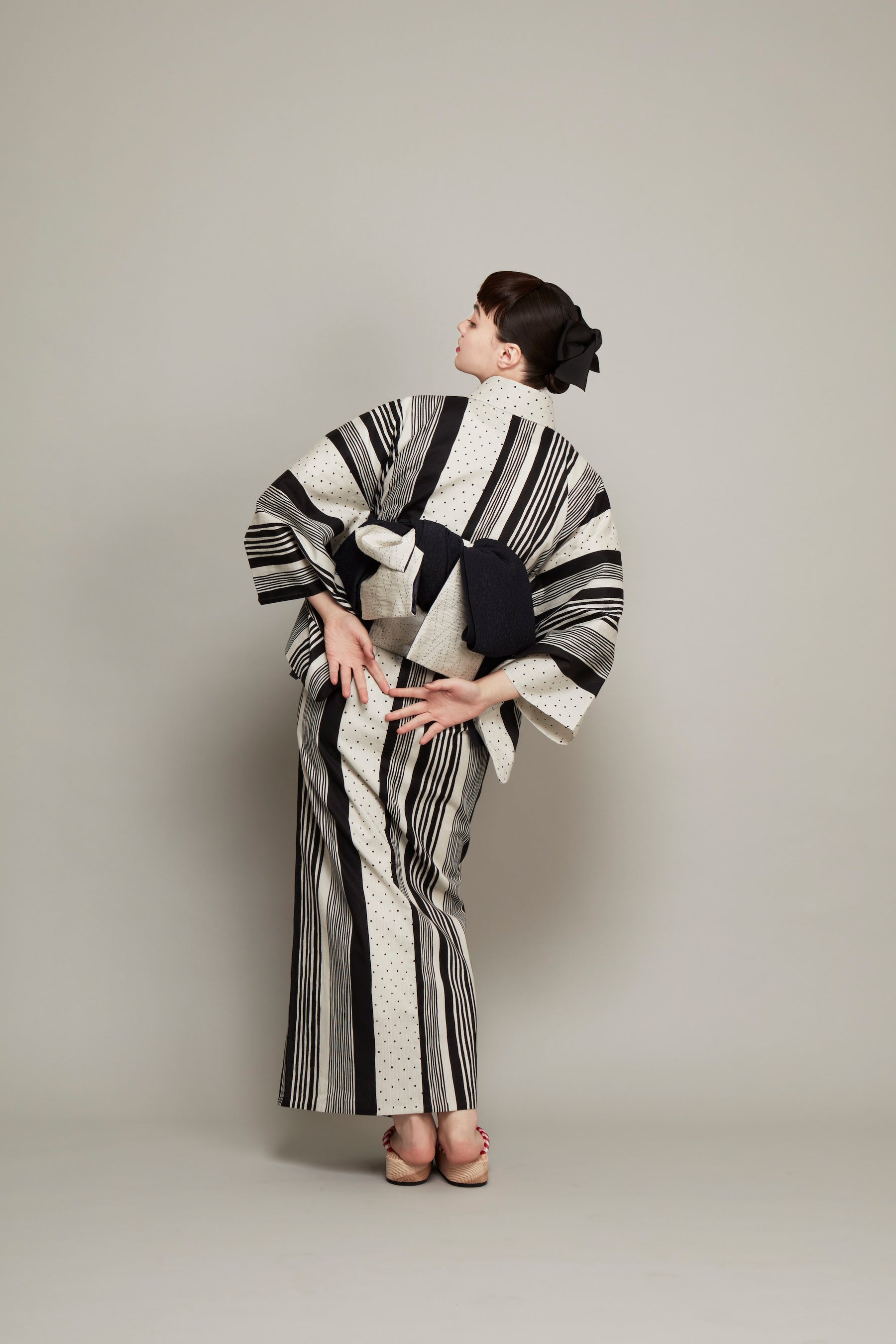 中原淳一が描いた雑誌の挿絵をもとに、ドットとストライプを掛け合わせたデザイン。ビジュアルでは、衣紋を詰め、ウエストを際立たせた原画の着こなしをもとにした対丈スタイルを再現しています。