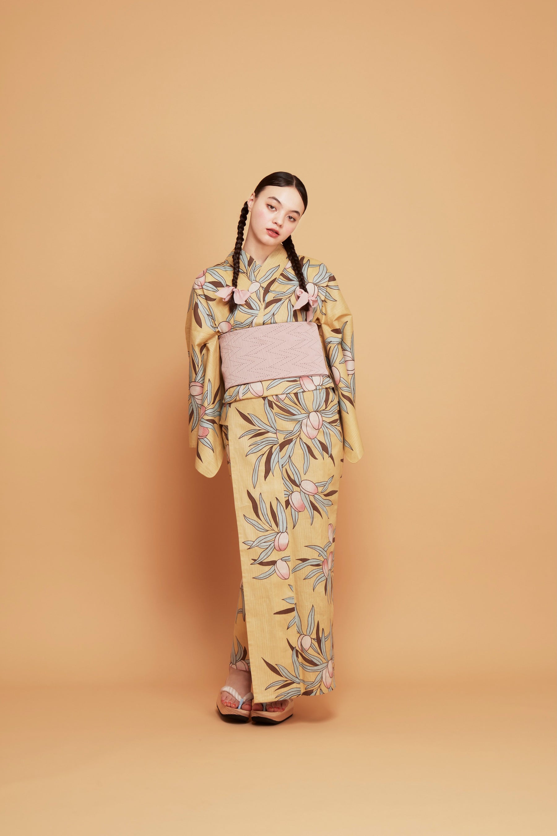 中原淳一がデザインした便箋に描かれたイラスト「ひとり」の少女の装いをもとに再現。桃を思わせる果実のモチーフが、夏の装いにやわらかな彩りを添えます。
