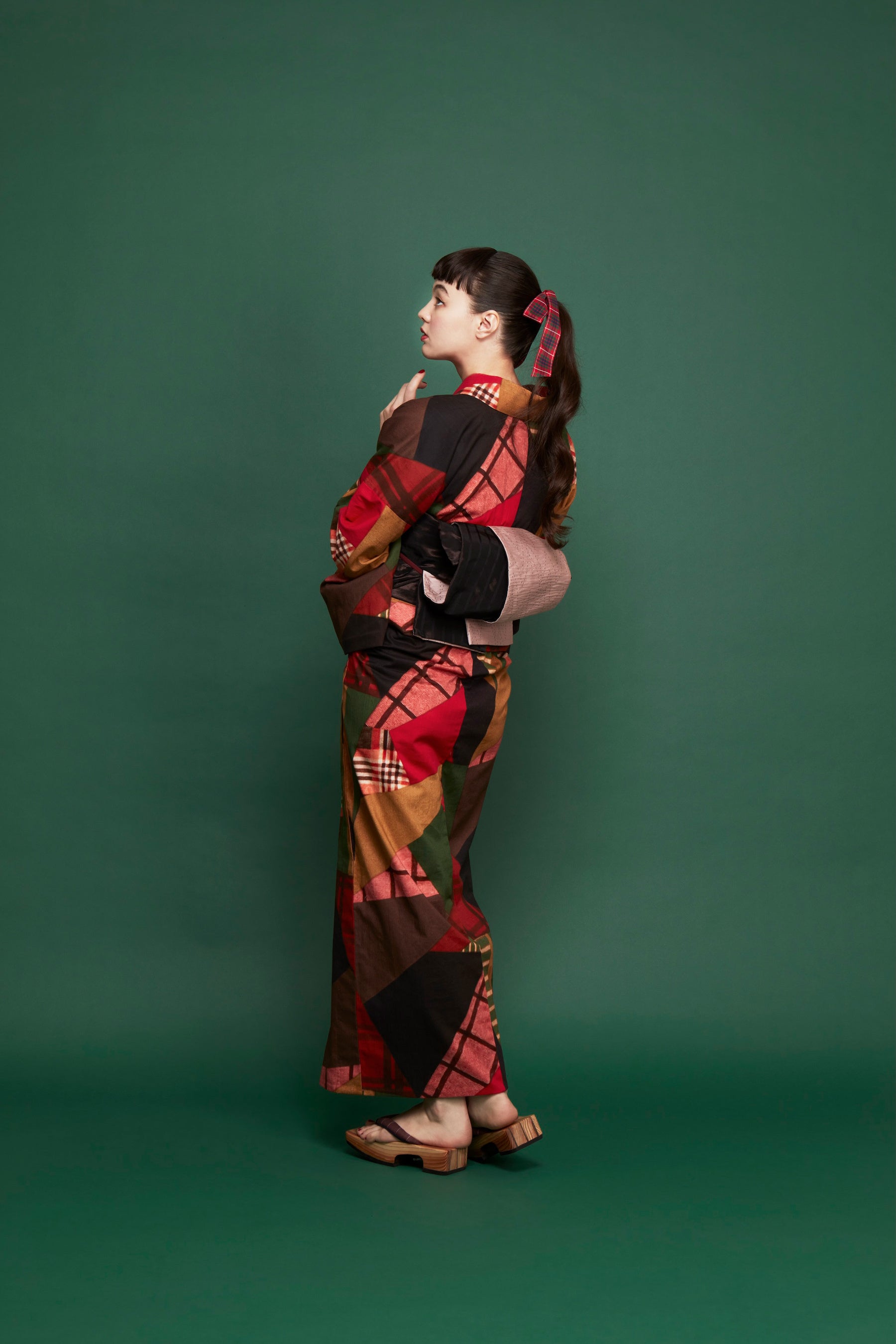 戦後の厳しい暮らしの中で、生活を楽しくするアイデアとして中原淳一が提案していた「パッチワークのきもの」をもとにデザインしたゆかた。インクジェット染色により、その風合いを繊細に再現しました。深みのある色合いで、初秋まで長くお楽しみいただけます。