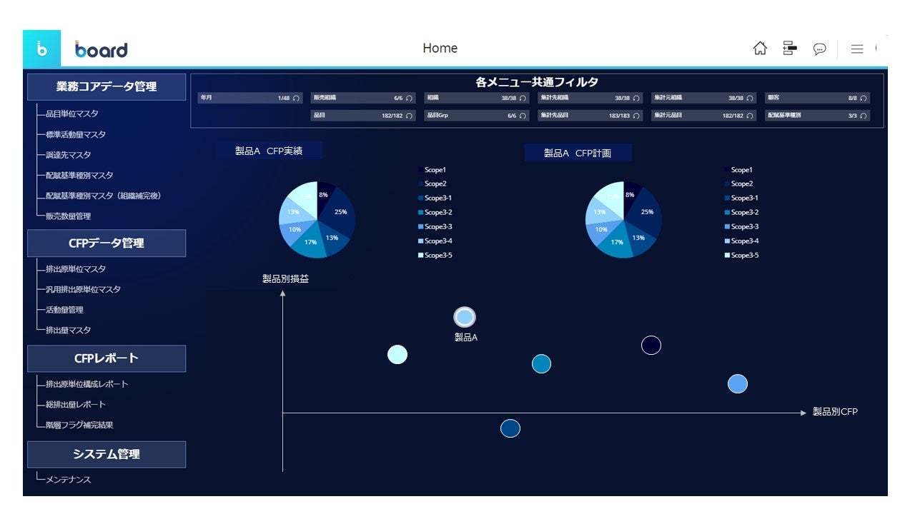 製品別カーボンフットプリント(以下:CFP)を中心としたサステナビリティ関連の情報と、製品別の損益情報を同一システム内で管理することで、サステナビリティと収益性の両輪での経営意思決定を支援することをコンセプトとしています。特に、製品別CFPの可視化においては、国際的な枠組みであるWBCSD PACTによるPathfinder Frameworkに準拠した複数の積上計算機能を標準的に装備しており、BOMや排出原単位マスタ等の設定で製品別CFPを算出することが可能です。加えて、製品別の損益情報を同一基盤に保持することで、温室効果ガス削減に向けた意思決定にあたり、財務側面からの定量的な評価も可能となります。また、本ソフトウエアはクラウド型のCPMソリューションであるBoardによるユーザライセンス型でのサービス提供を予定しており、包括的なグリーンコンサルティングサービスを提供し豊富な実績を持つNTTデータとの共同開発を通じ、より効果的かつ実効性のあるソフトウエアとして提供いたします。