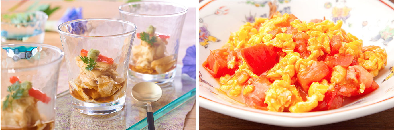右:鬼怒川観光ホテルの料理長の得意料理は中華。夏に甘みの増す栃木県産のトマトを使った卵炒めをお見逃しなく。