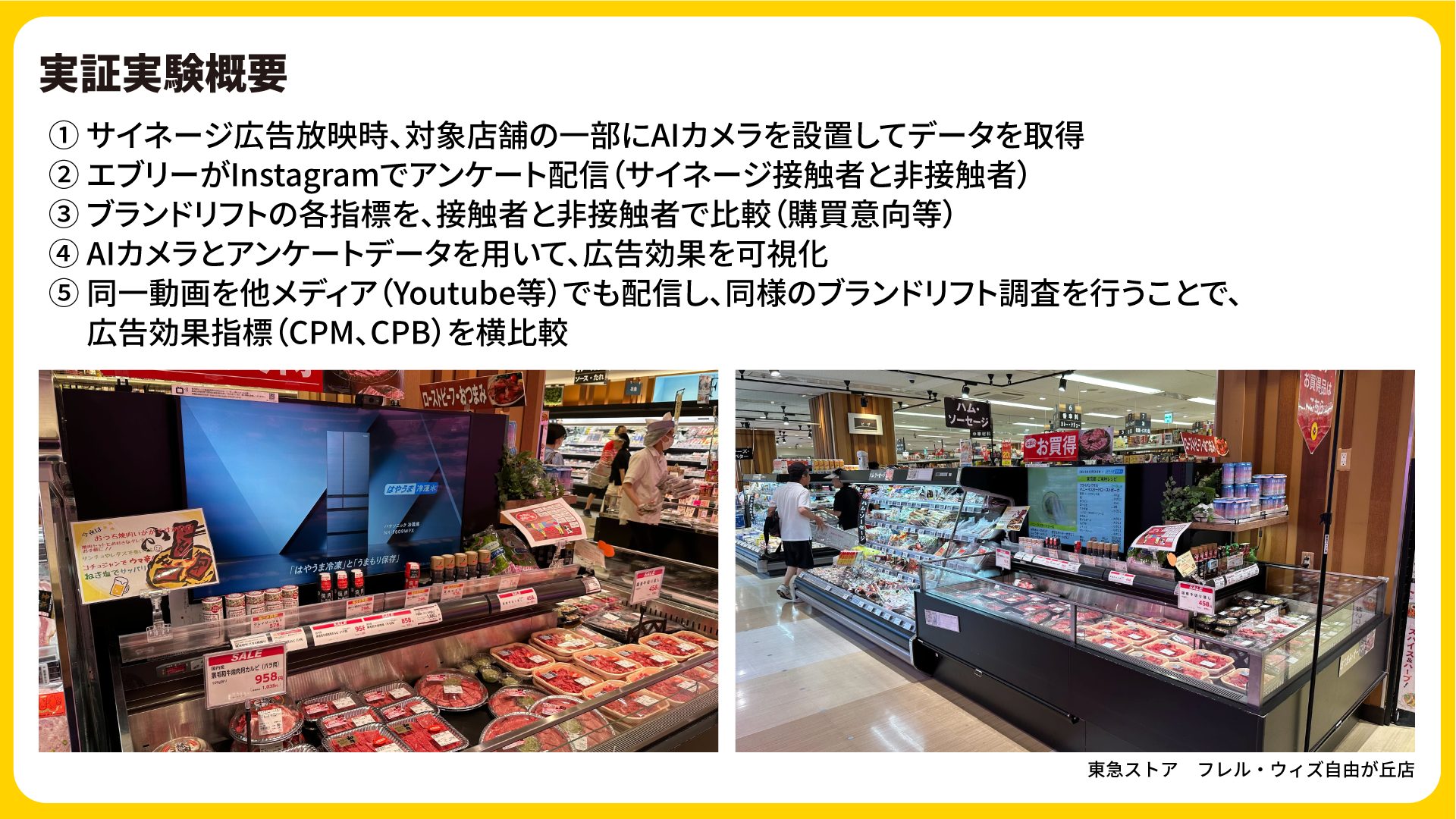 そこで、全国のスーパーマーケット2,300店舗以上で、約7,000台の店頭サイネージを運営している『DELISH KITCHEN』では、量と質を掛け合わせた“ブランドリフトのコスト効率”を可視化することで、店頭モーメントならではの価値を証明できるCPB算出の実証実験を実施しています。