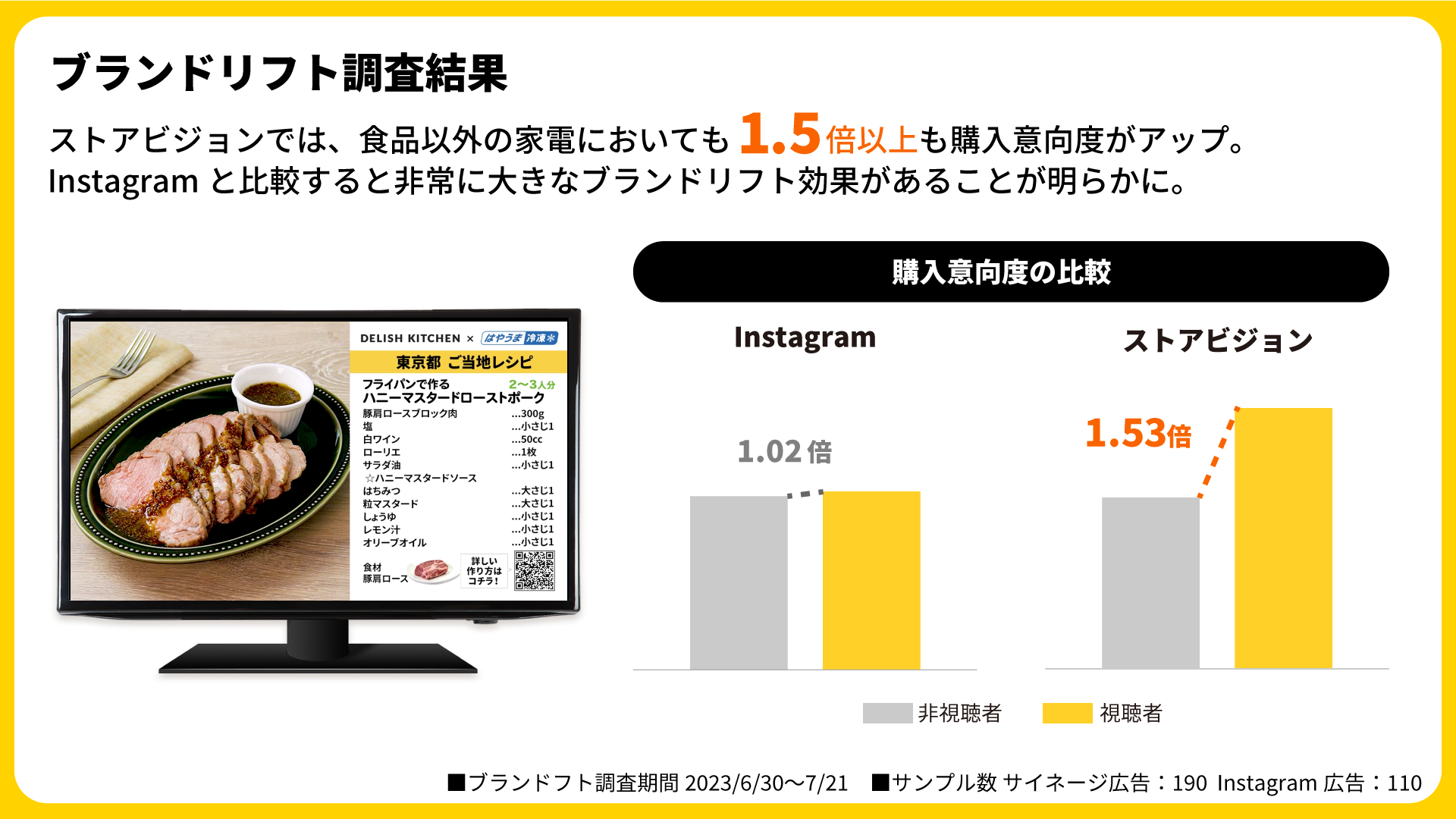 さらに、CPBは「ストアビジョン」で13.0円、Instagramで38.4円となり、「ストアビジョン」が3分の1近く安価に態度変容を促すことができることがわかりました。これらの結果から、家電においても、購買に最も近い買い物シーンでリーチし、レシピと機能紹介を組み合わせた訴求をすることで、高いブランドリフトを実現できることが証明されました。