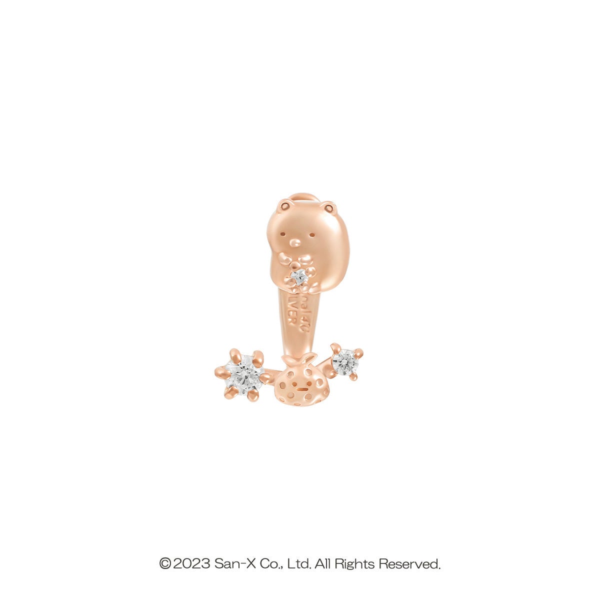 上から「ぺんぎん?」、「とんかつ」、「とかげ」、「ねこ」、「しろくま」が輪になって顔を並べるネックレスや、コロコロとすみっコたちが転がるリングカフは、肌馴染みのいいピンクゴールドカラーで大人かわいい表情へと彩ります。顔周りがパッと明るくなる愛らしいデザインが、いつものコーディネートにさりげないスパイスを添えてくれるはず。