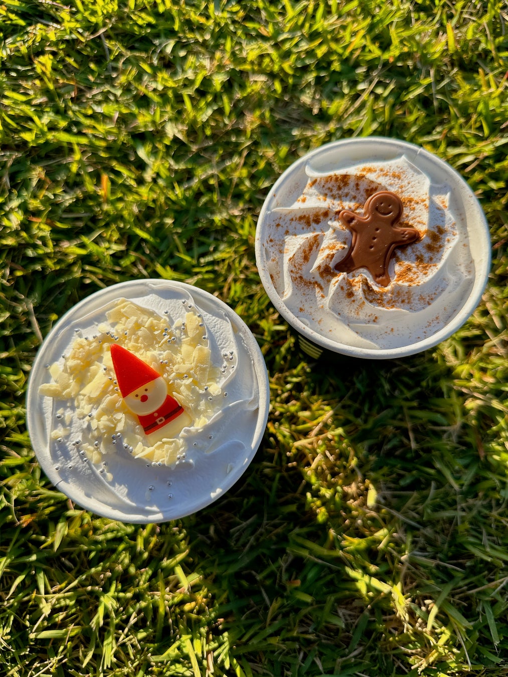 小さなトントゥがのったお子さまから大人まで大人気の濃厚チョコレートドリンク、ホッと温まるスパイスが効いたジンジャーブレッドラテ。