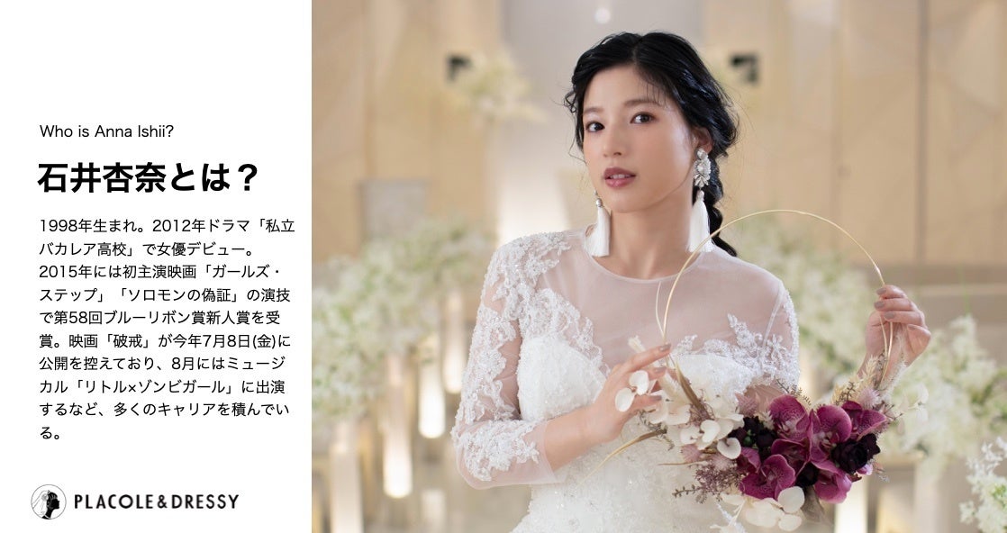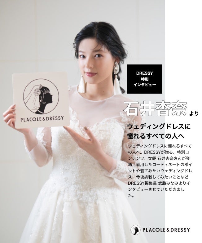 「PLACOLE & DRESSY」ブランドを展開する、冒険社プラコレ(本社:神奈川県鎌倉市、代表取締役CEO:武藤功樹)は、ウェディングドレスをもっと身近に楽しんで欲しいと考え「ウェディングドレスに憧れるすべての人へ」PLACOLE&DRESSYが贈る、特別コンテンツをスタート。今月は女優 石井杏奈さんを迎え、メッセージを頂きました。
