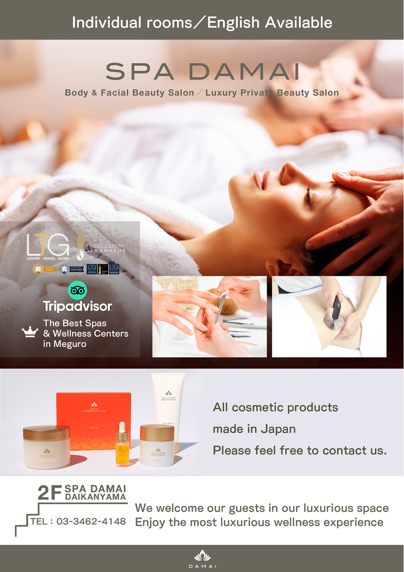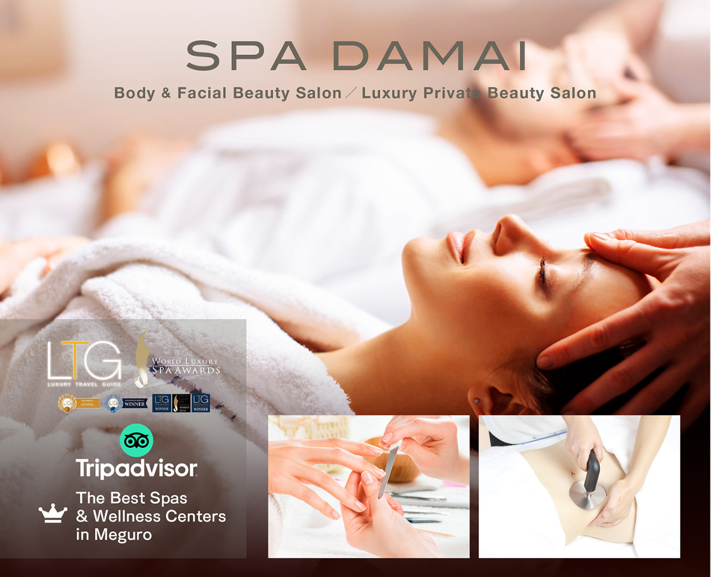 「スパ ダマイ」は、2012年8月に代官山に開業。隠れ家的なスパとして、多くの著名人の方々にもご愛顧いただいております。また、ブティックスパ(路面スパ)としてのサービスやシステムが高く評価され、2017年以来、数々のスパアワードを受賞しています。そこで働くセラピストたちが開発したホームケア製品は、さまざまなメディアにご紹介いただき、ベストコスメ受賞の実績もございます。国際的なスパアワードで日本のスパが受賞したのは「スパ ダマイ」が初となります。