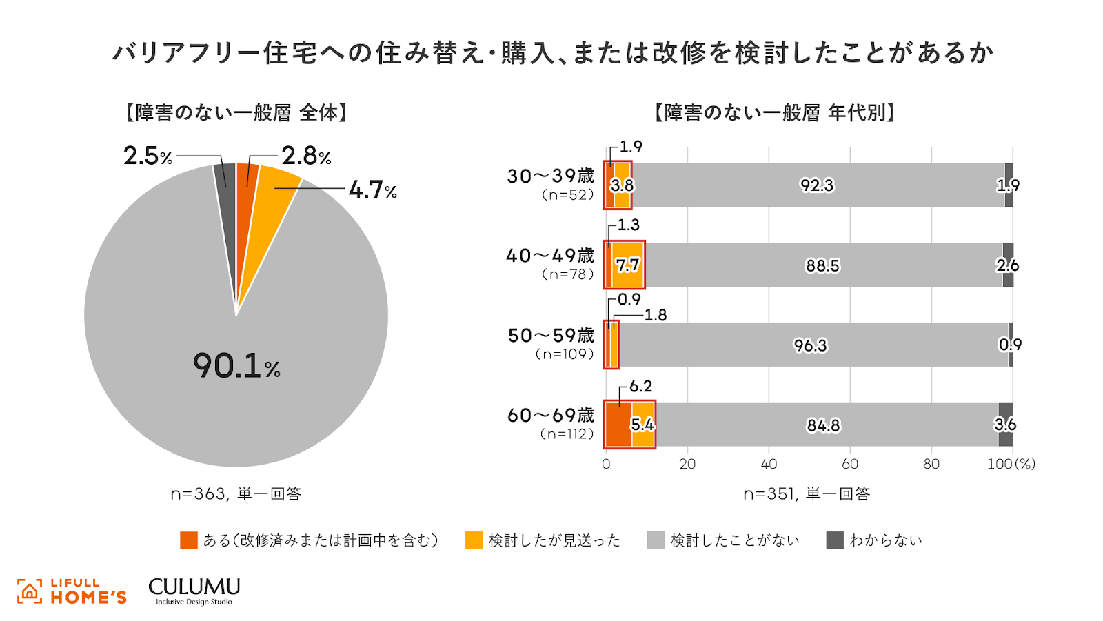 バリアフリー住宅への住み替えや購入、改修の検討“未経験者”は、一般層では約9割にのぼる。また、年齢が上がるにつれてバリアフリー住宅の検討割合が増加し、特に60代で顕著になる。