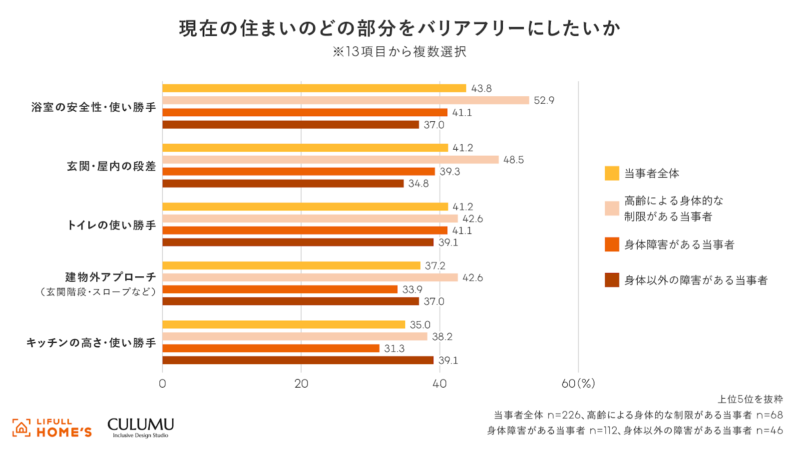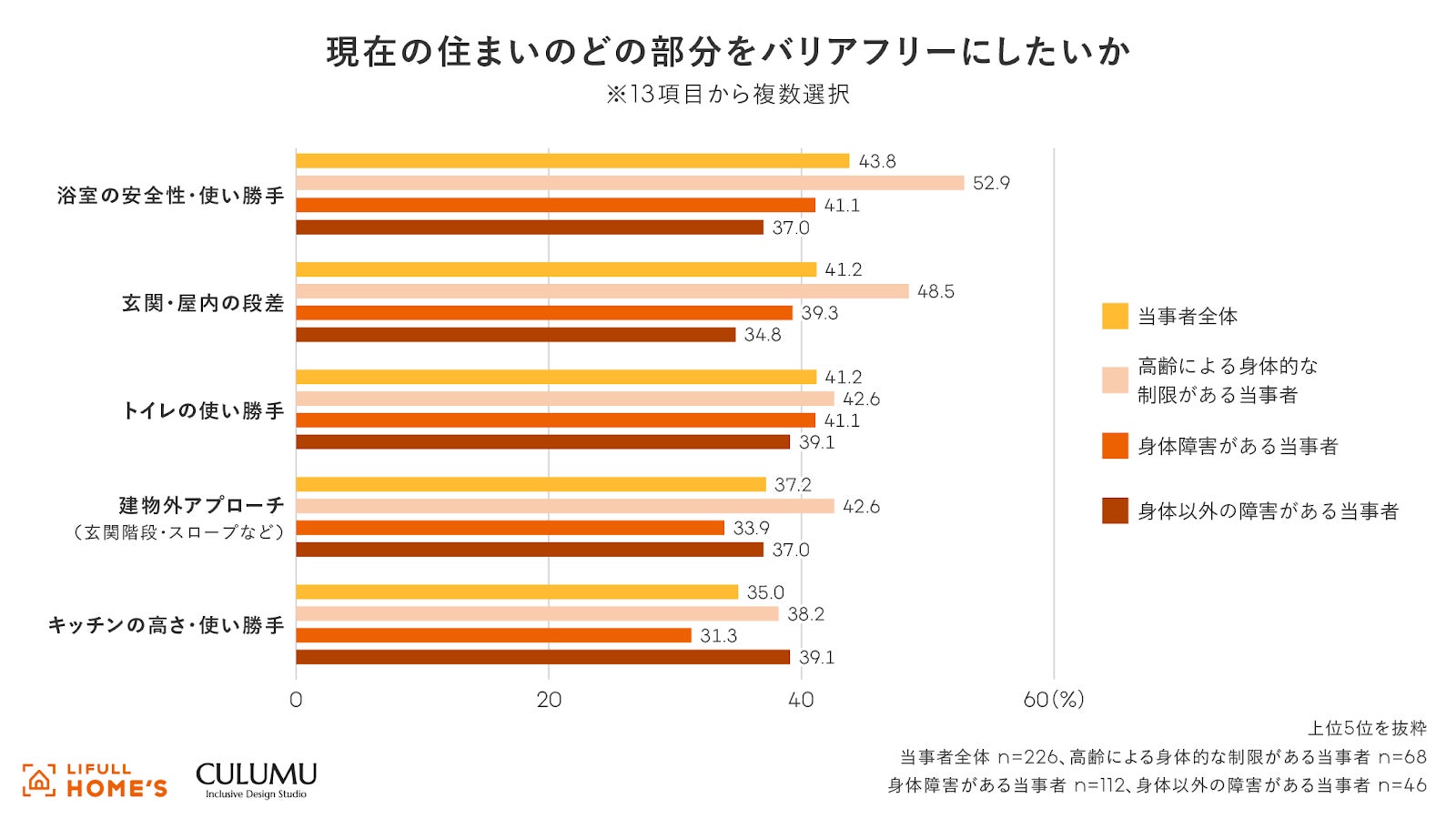 高齢による身体的な制限がある当事者は、安全性が最も優先される「浴室の安全性・使い勝手」(52.9%)と「玄関・屋内の段差」(48.5%)が上位です。「建物外アプローチ」(42.6%)と身体および身体以外の障害がある当事者よりもバリアフリー化の希望が高い箇所です。