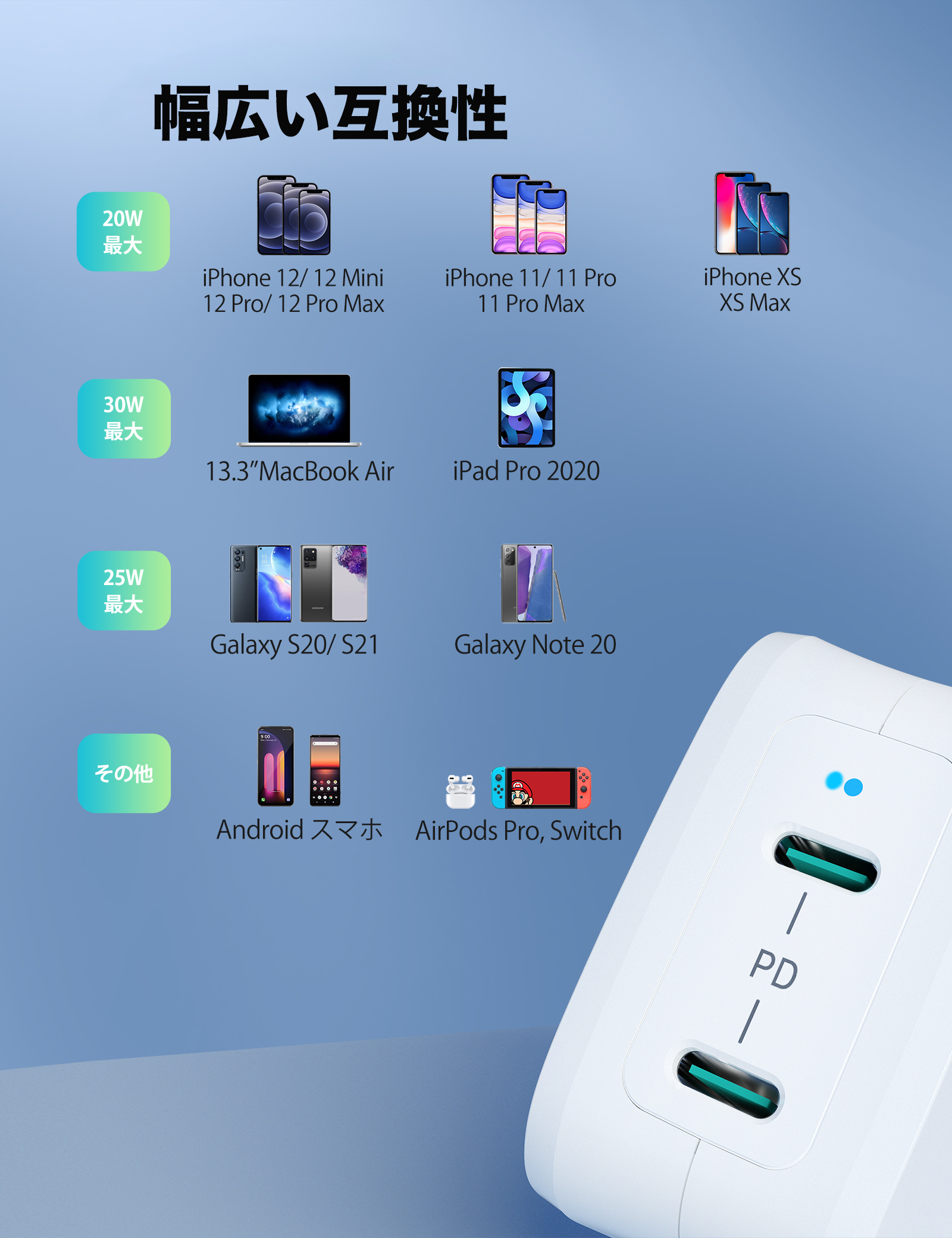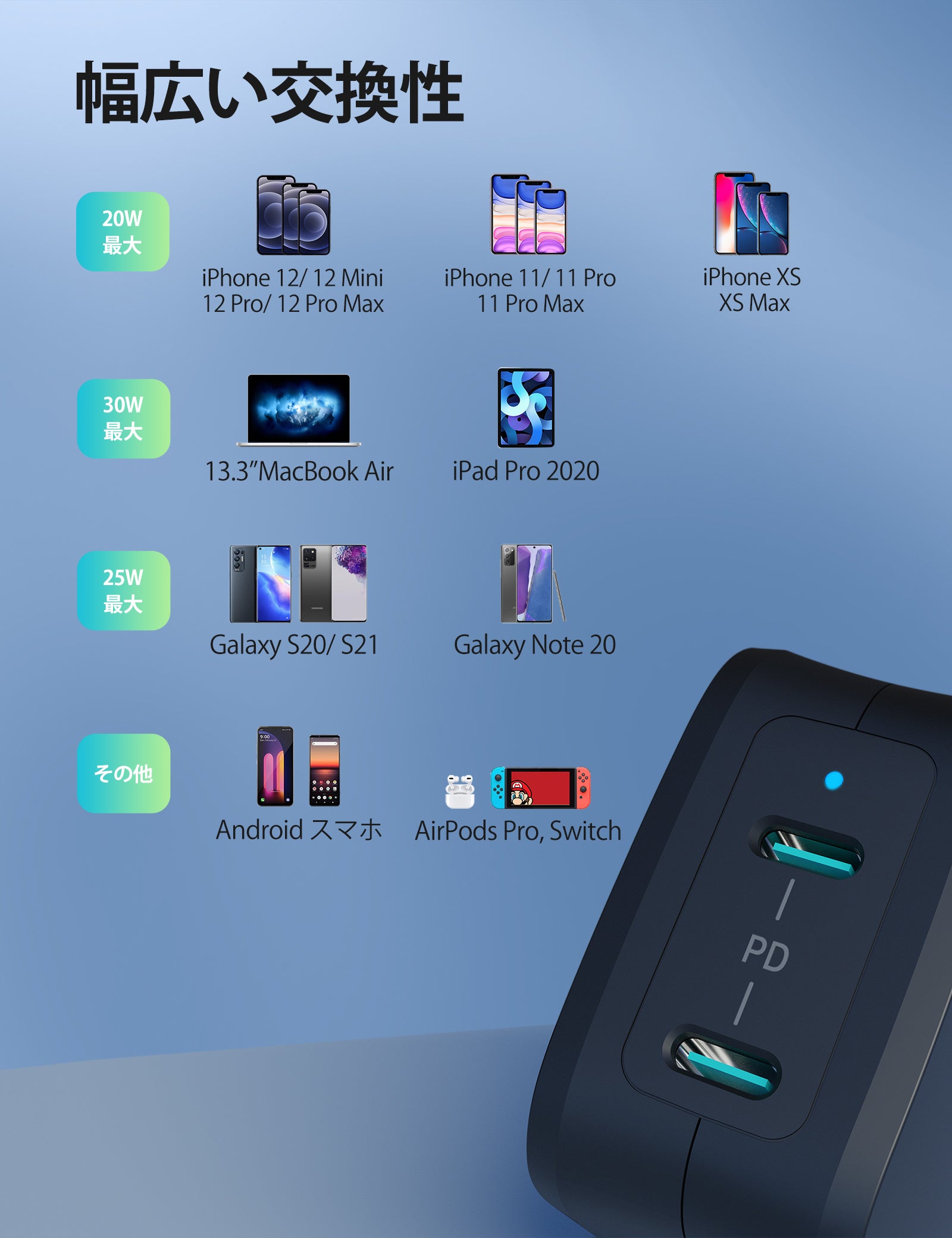 ■ 2ポート搭載による幅広い互換性最新のスマートフォンからタブレット、ゲーム機にまで使用できる幅広い互換性があり、これ一台でガジェットライフがより自由に。