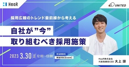 ユナイテッド株式会社(本社:東京都渋谷区、代表取締役社長 兼 執行役員:早川 与規、証券コード:2497、以下:ユナイテッド)は、3月30日(木)12:00より、HeaR株式会社 代表取締役CEO 大上諒氏をお招きし、「採用広報施策」をテーマに参加費無料のウェビナーを開催することをお知らせいたします。