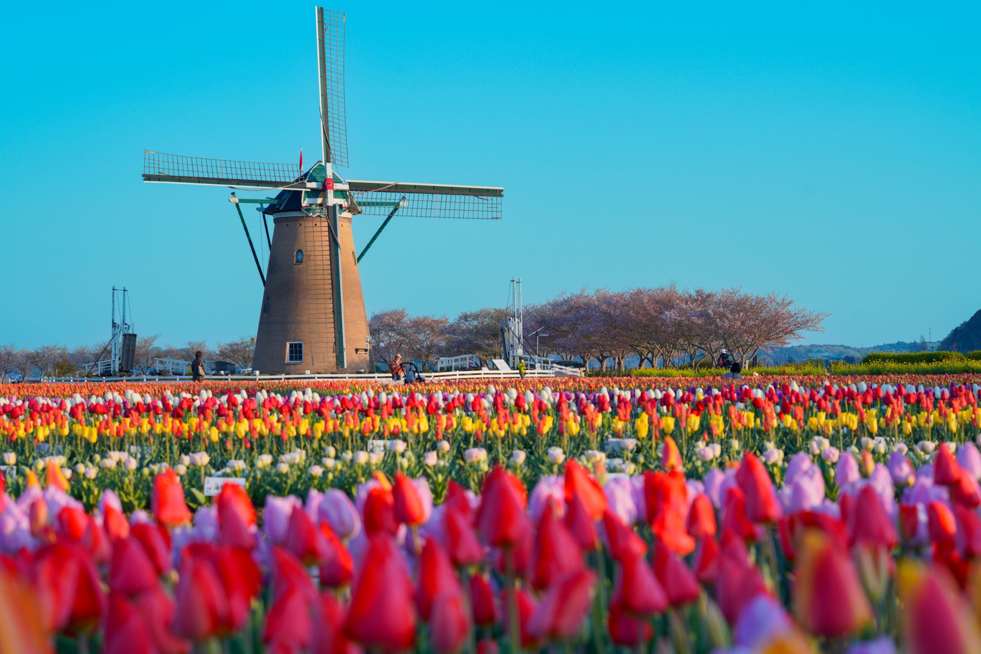 オランダ風車がシンボルの佐倉ふるさと広場では、春、一面のチューリップ畑が広がります。今年は、「香る」、「移り色」、「斑入り」など珍しい品種を含んだ約100種・70万本のチューリップが楽しめ、日本初上陸の品種も登場します。
