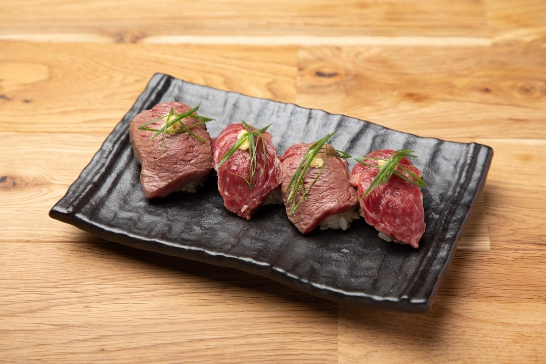 黒コショウとニンニク風味のガーリックライスをシャリに使用し、松阪牛で肉寿司に仕上げました。