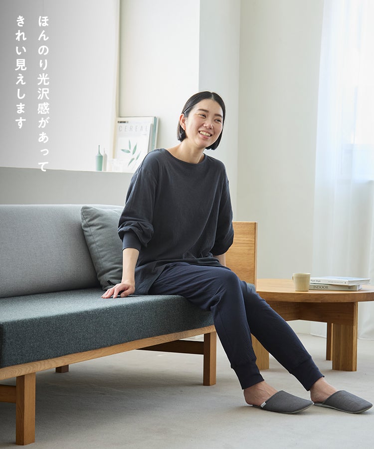 パジャマというと、襟付きのものや、そのまま過ごすには着替えが必要なデザインのものが多いのですが、こちらは朝起きてからそのまま簡単な家事をしたり、おうちで過ごしやすいデザインに。ゆったりとしていて締め付け感がないのに、女性の体がきれいに見える形です。