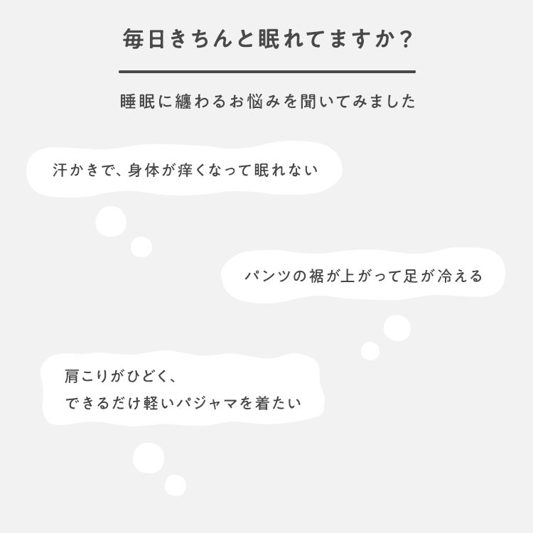 眠りについて、多くの方がお悩みなのでは?という思いから、当店のお客さまにインタビューをさせていただきました。お客さまお一人お一人とお話する中で実感したのが、お肌に一番近く触れる「パジャマ」に対してのお悩みでした。