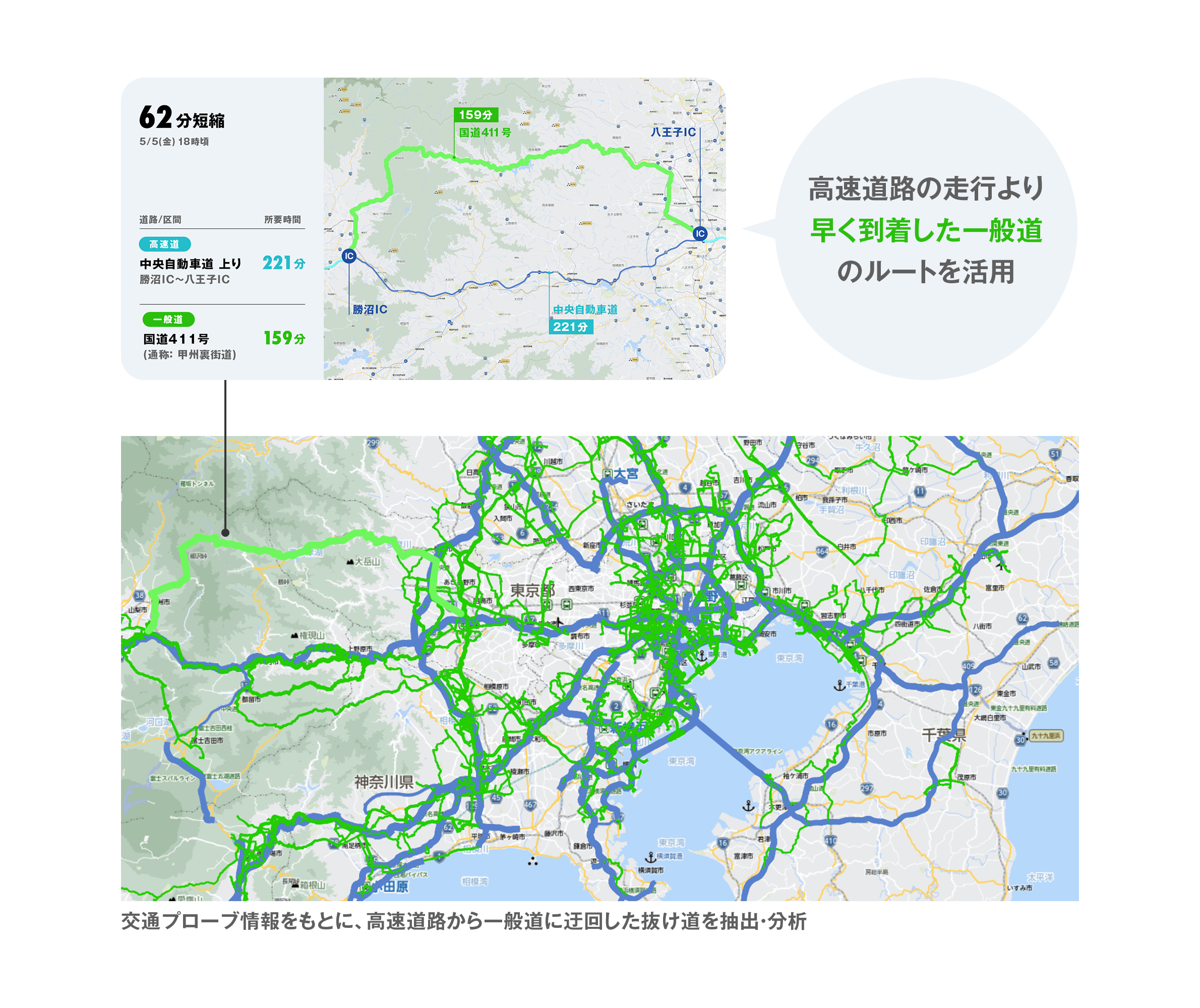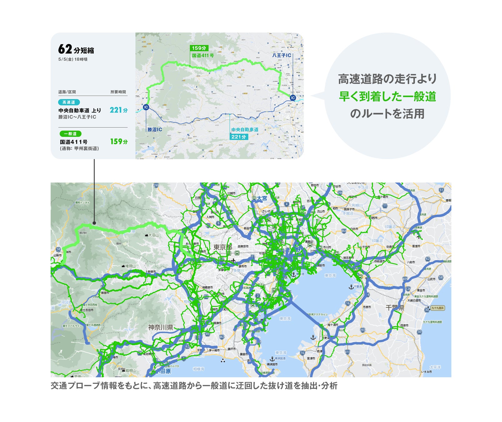 より渋滞回避レベルの高い複数の「超渋滞回避ルート」を算出するにあたっては、これまでの「超渋滞回避ルート」算出のロジックに加え、新たに過去の週末やゴールデンウィークなどの交通プローブ情報から高速道路から一般道に回避した抜け道を抽出して、そのまま高速道路走行した場合よりも早く到着したルートなどを分析・活用しています。