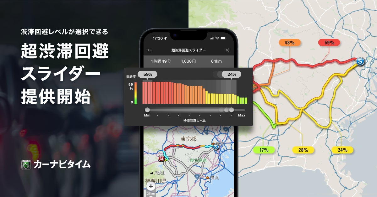 『カーナビタイム』、走行データを活用し、渋滞を積極的に避けたルートが選択できる「超渋滞回避スライダー」を提供開始