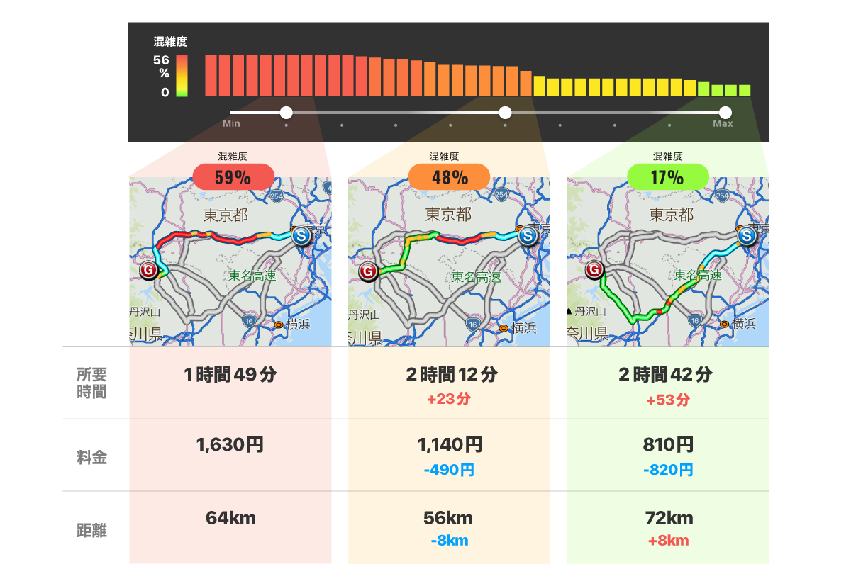 走行距離が伸びても渋滞をできる限り避けたい、渋滞してもいいから走行距離を抑えて走りやすい高速道路を走りたい、などユーザーの好みや志向によってより良いルートを選択できるようにすることで、渋滞のストレスを減らし、快適なドライブを楽しんでいただければ、と思っております。