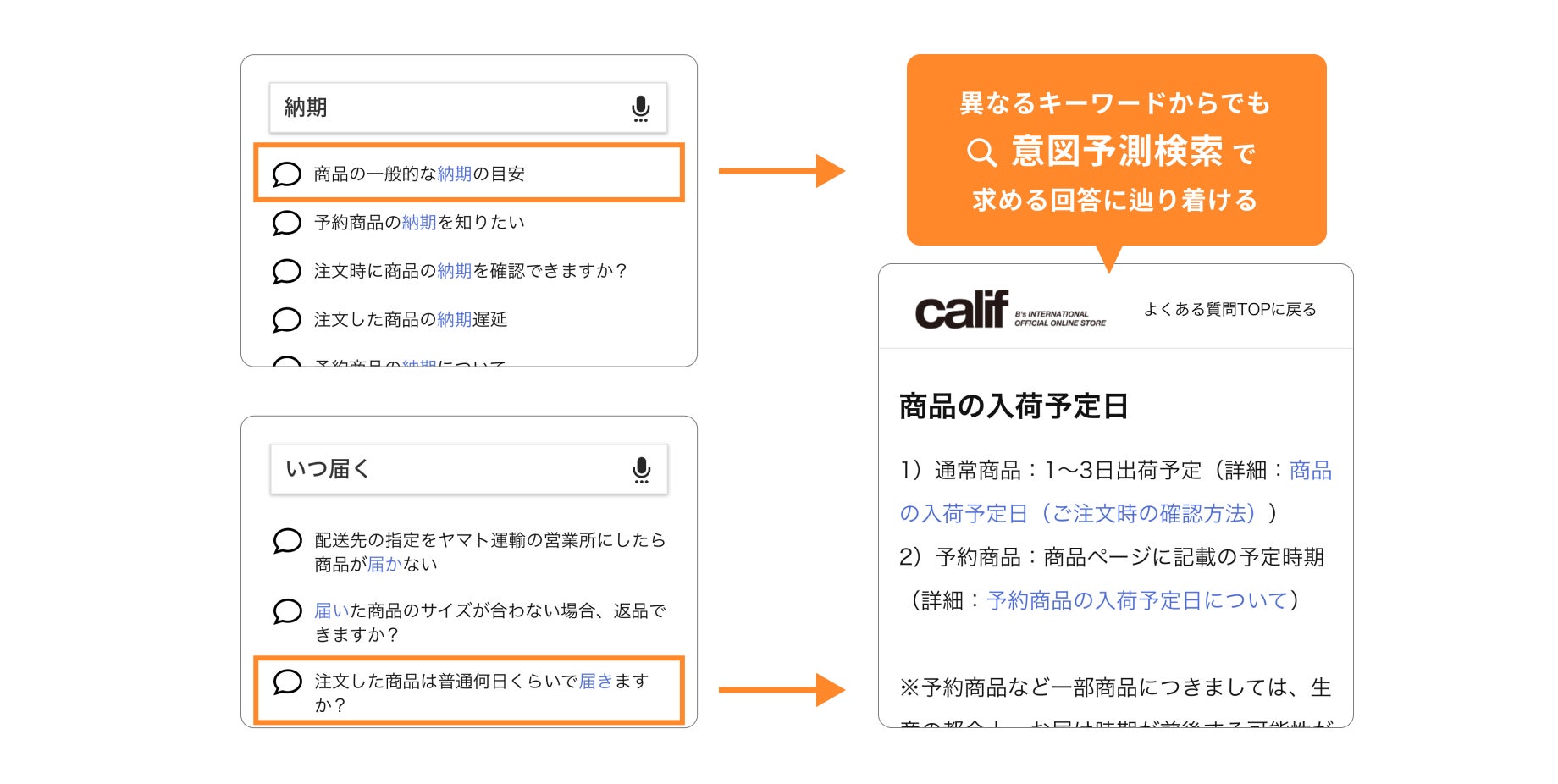 「意図予測検索」とは、FAQに入力された言葉から検索者が何を知りたいかの「意図」を予測し、その意図に合致する回答をすばやく検索するシステムです。検索キーワードが曖昧だったり感覚的だったり、あるいはスペルミスや漢字/かなの表記揺れがあったりしても、お客様の疑問の解決につながる最適なFAQページをすばやく探し出すことができます。1つひとつのFAQ記事に対して、テクニカルライターとAI技術に よってユーザーが入力するであろう単語を予測し、約50の「意図表現」を作成しています。
