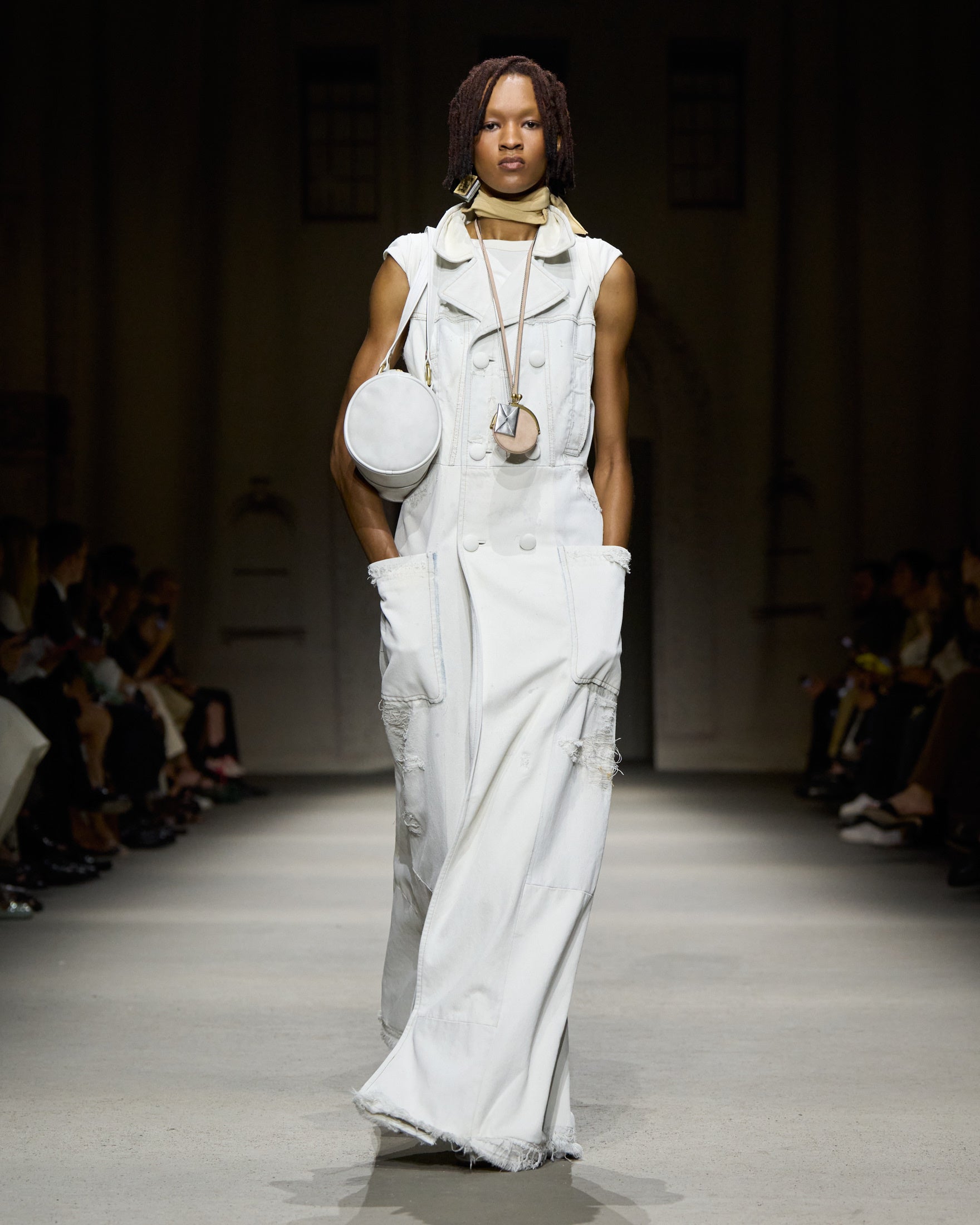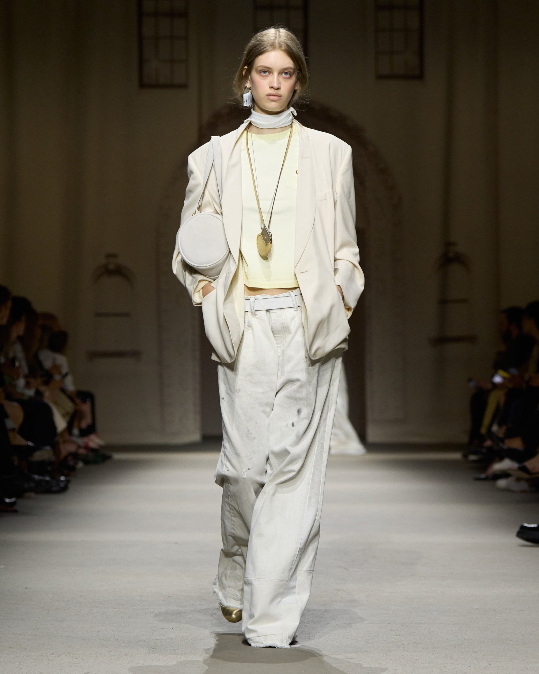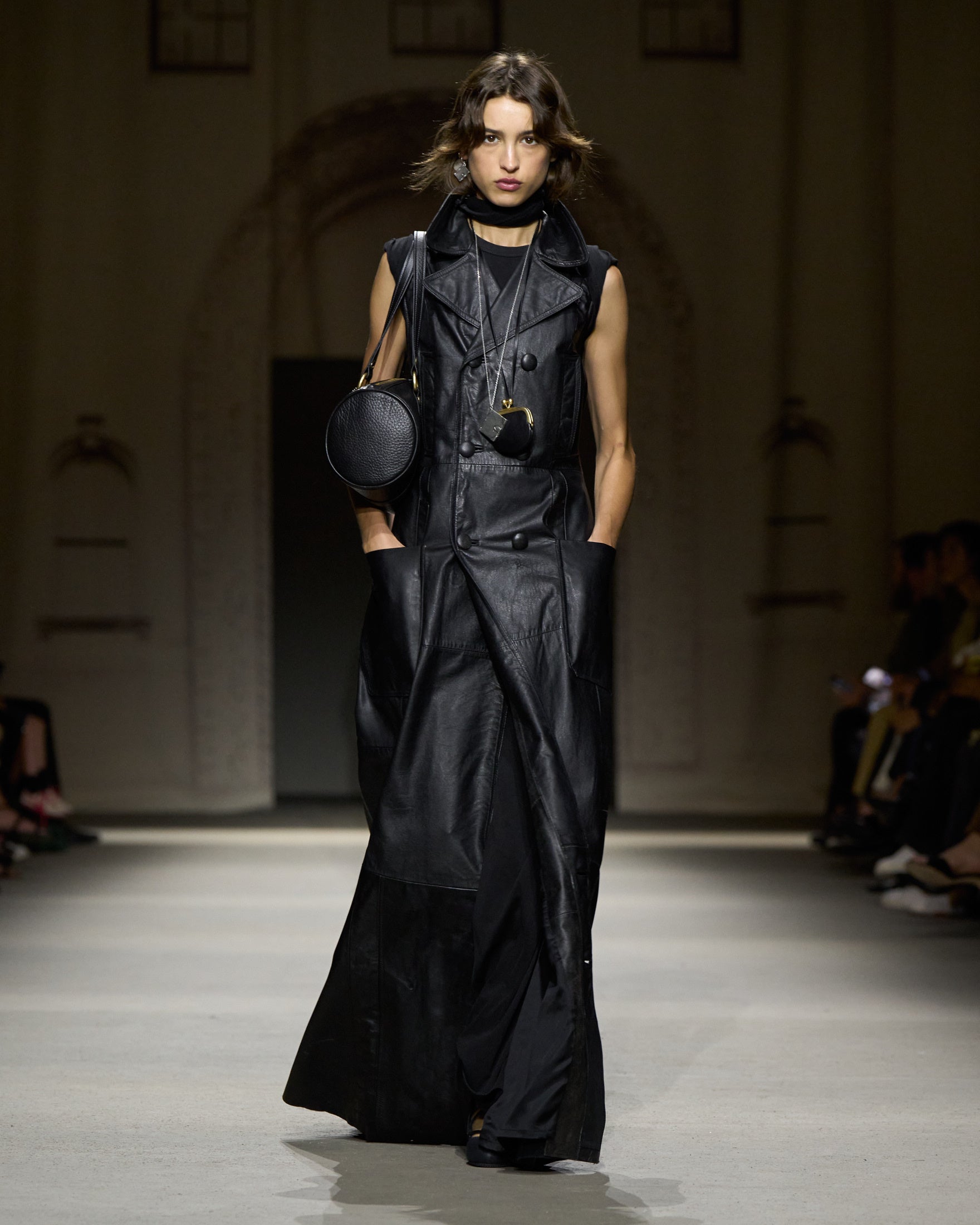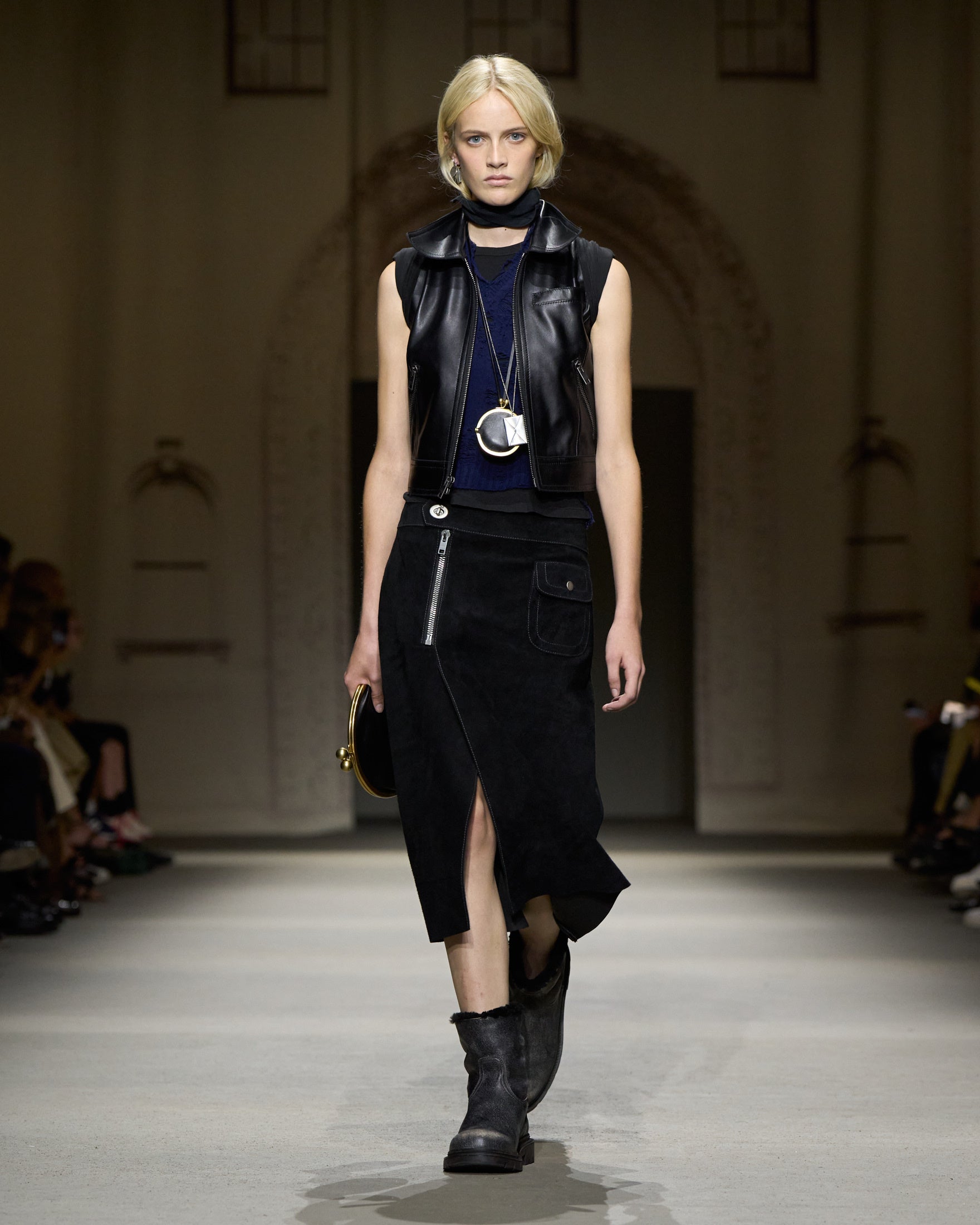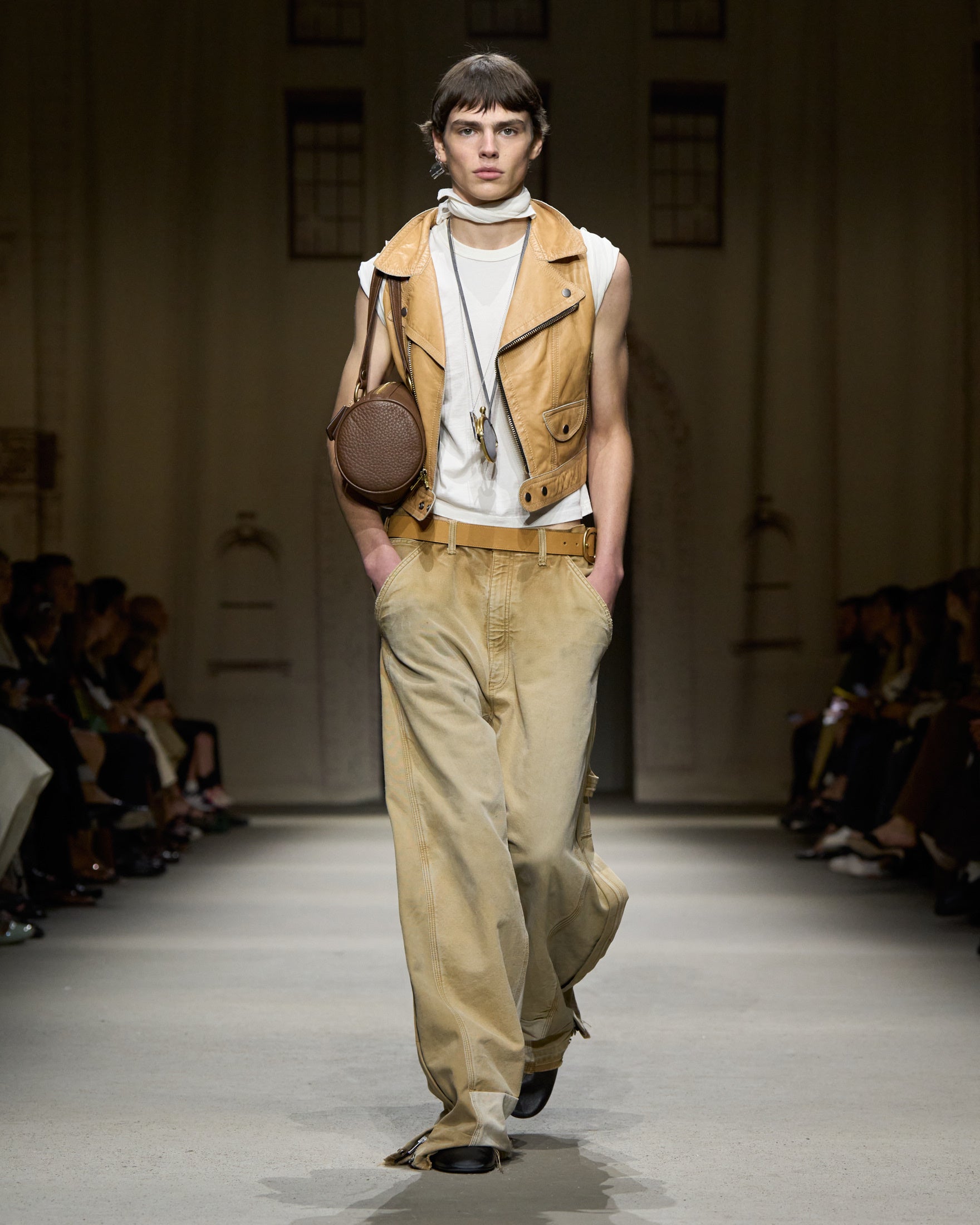 カラーパレットは、ホワイト、ハニーブラウン、タン、フェードブラックを基調に、パステルブルー、イエロー、グリーン、そしてメタリックのアクセントが加わります。アウターには、スエードやナッパ、ワックス加工レザーのモトジャケット、ベスト、ブルゾン、クロップドジャケットが登場。モールスキンのピーコートが素材のバリエーションを加え、リサイクルレザーを使用したブラックのモトジャケットは、ミニマルなディテールの金具で仕上げられ、シンプルなフォルムへの探求を象徴しています。