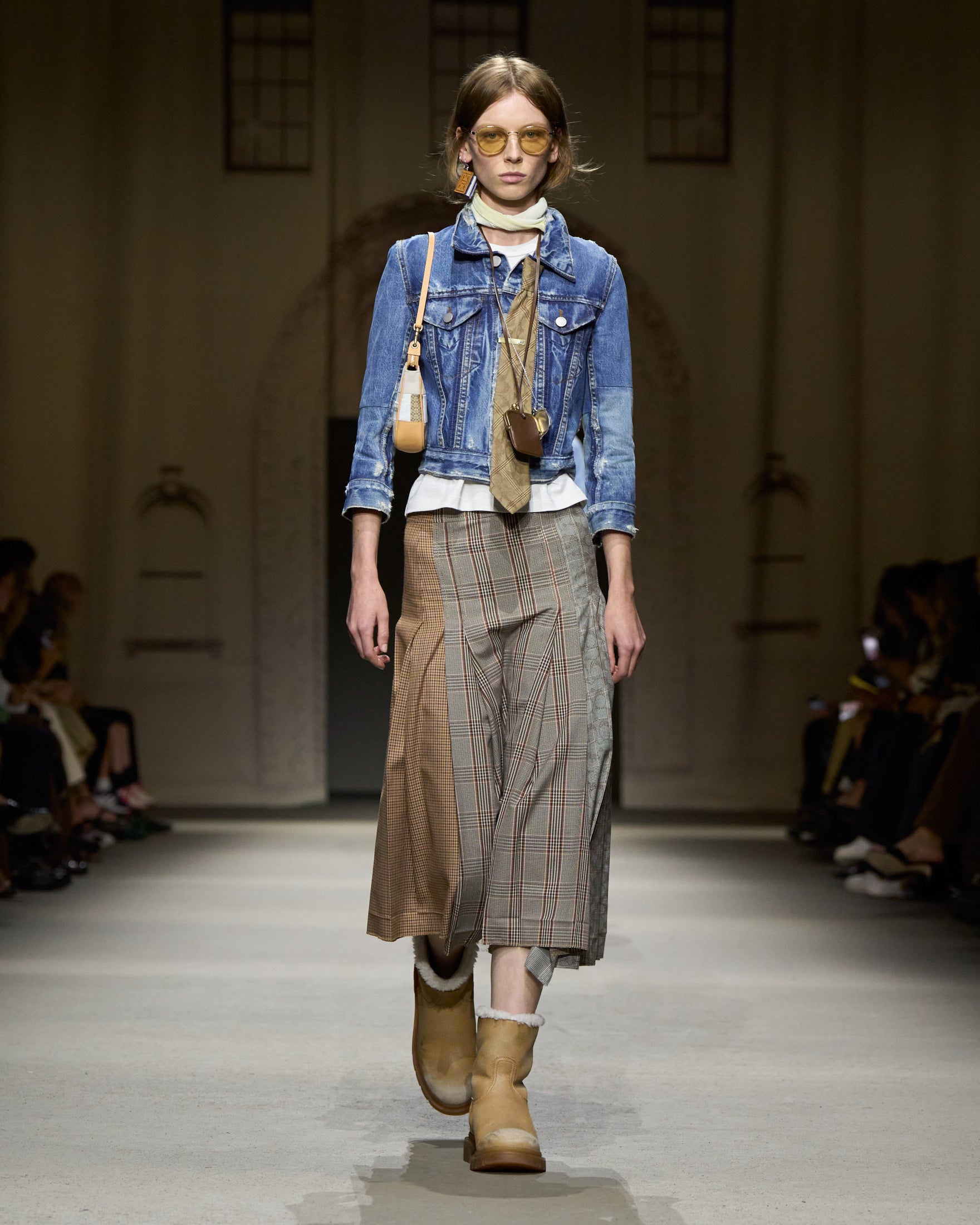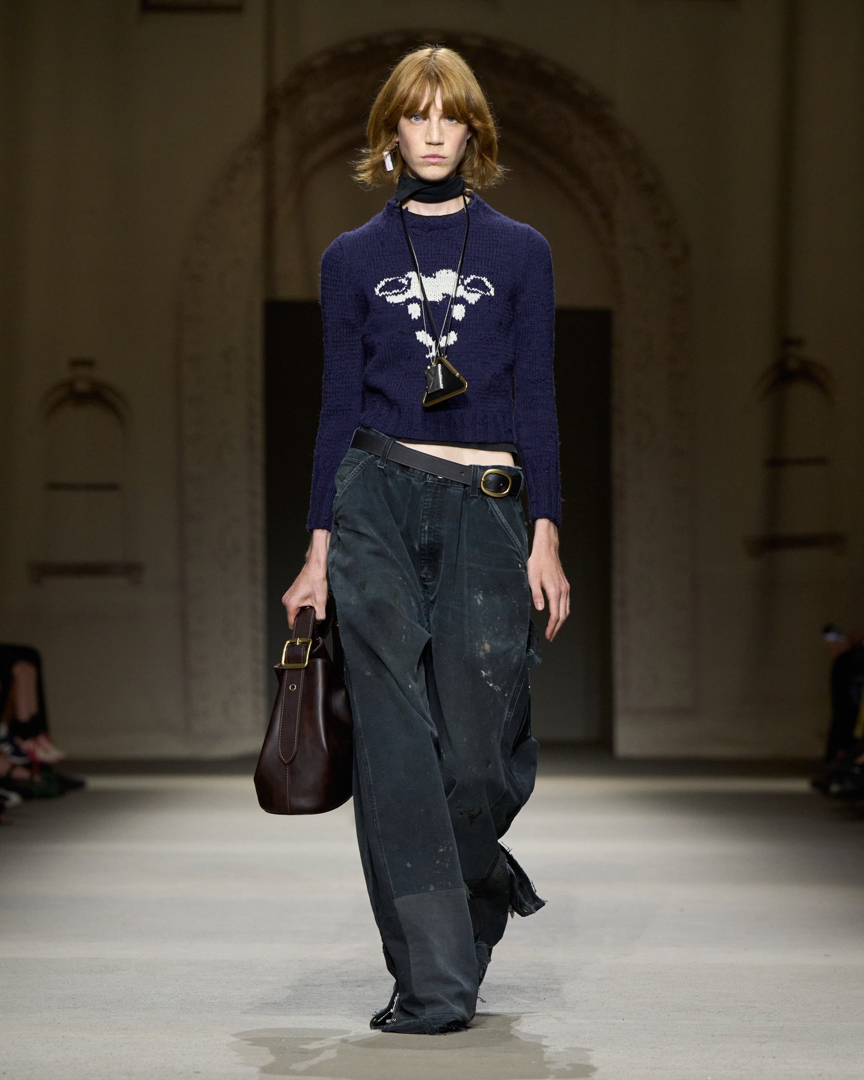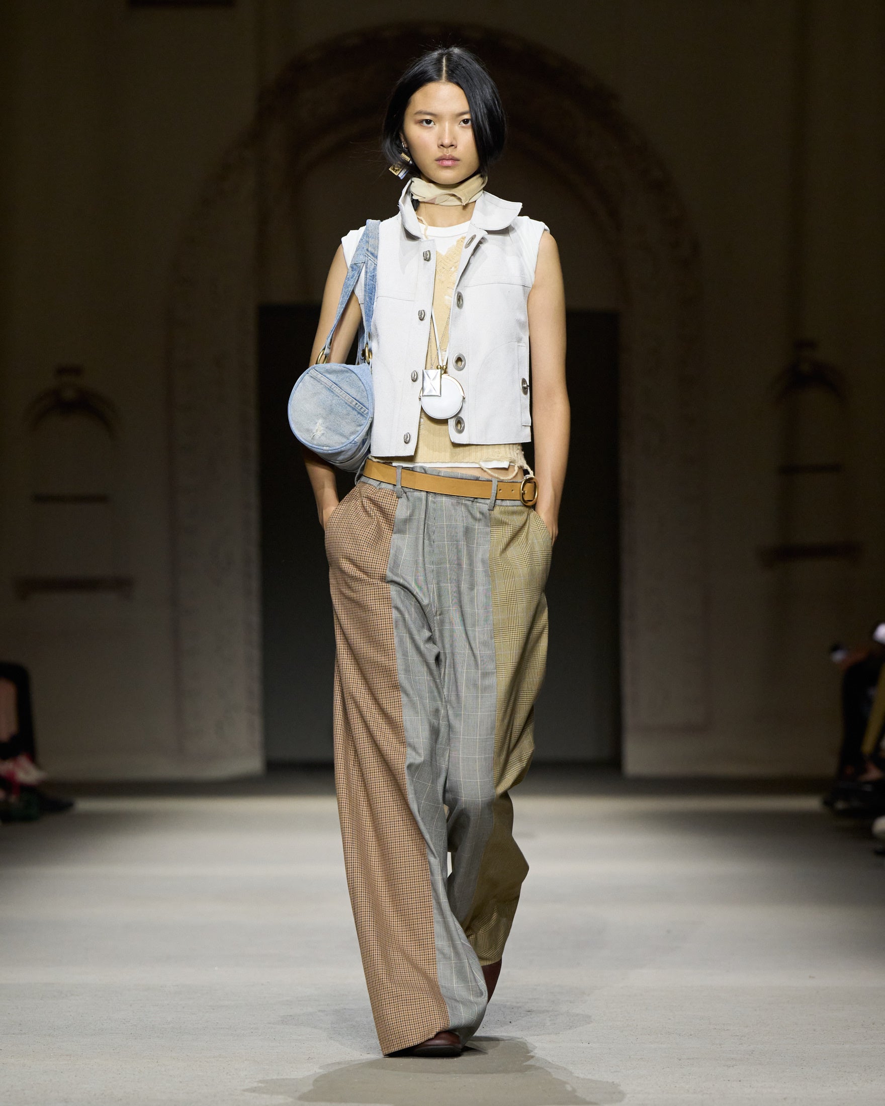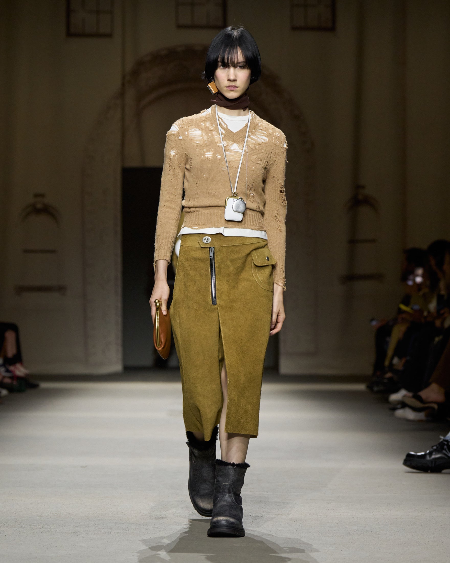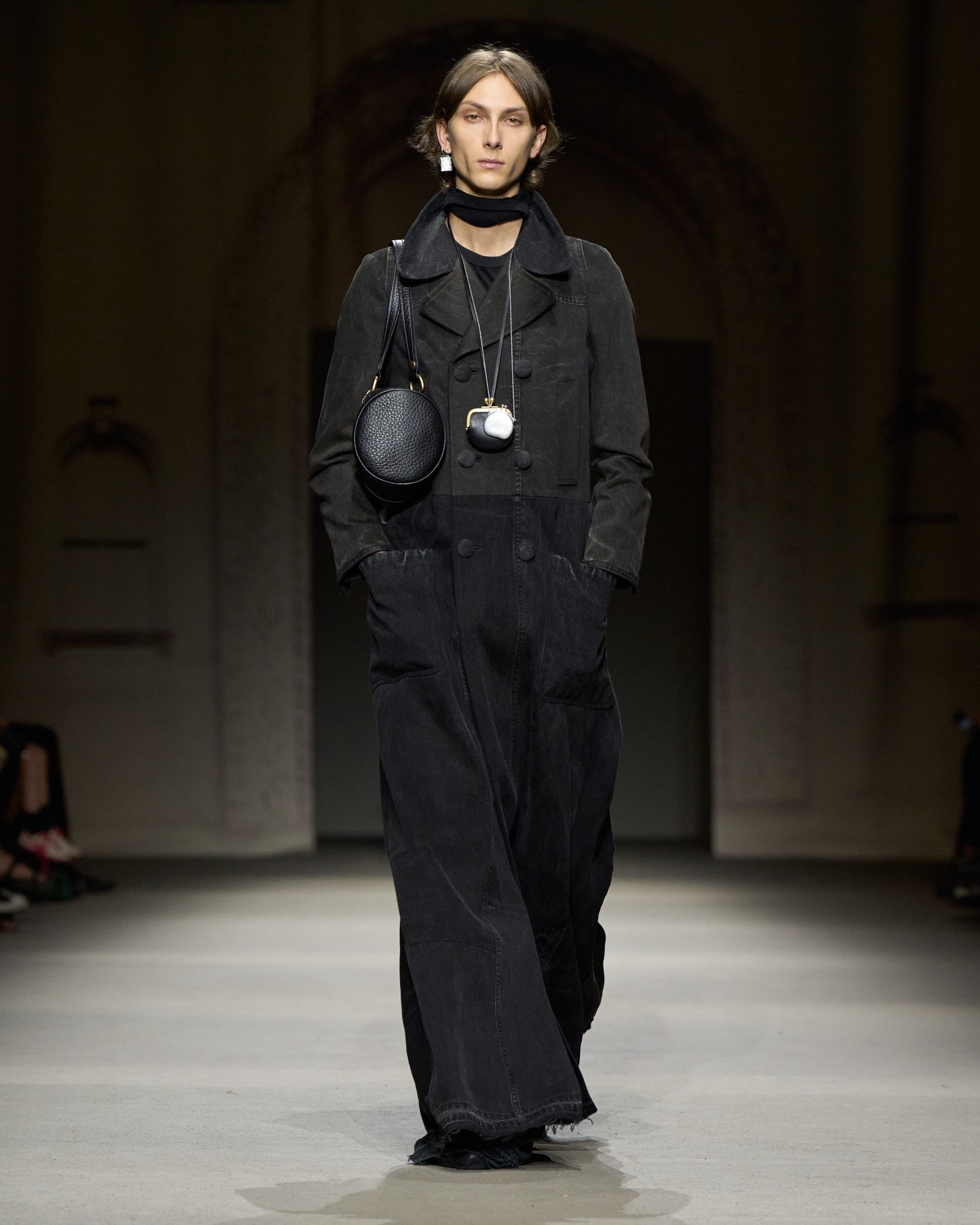 カラーパレットは、ホワイト、ハニーブラウン、タン、フェードブラックを基調に、パステルブルー、イエロー、グリーン、そしてメタリックのアクセントが加わります。アウターには、スエードやナッパ、ワックス加工レザーのモトジャケット、ベスト、ブルゾン、クロップドジャケットが登場。モールスキンのピーコートが素材のバリエーションを加え、リサイクルレザーを使用したブラックのモトジャケットは、ミニマルなディテールの金具で仕上げられ、シンプルなフォルムへの探求を象徴しています。