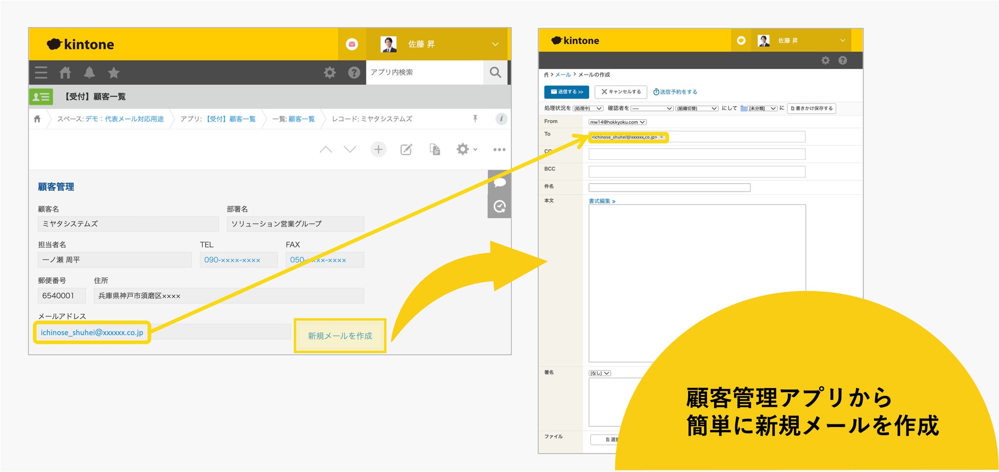 kintoneのレコード上で「新規メールを作成」ボタンを押すと、メール作成画面へ切り替わり、レコードに表示されている宛先が自動入力されるため、簡単に新規メールを作成することができます。さらに、社外当て宛てのメール確認なども、別のツールを使わずにkintoneのプロセス管理を活用して社内承認フローを進めることで、社内確認からメール送信までワンストップで対応できます。本オプションがkintoneに追加されることで、kintoneとメール機能の相乗効果により、メール業務がさらに効率的に進むことが期待されます。