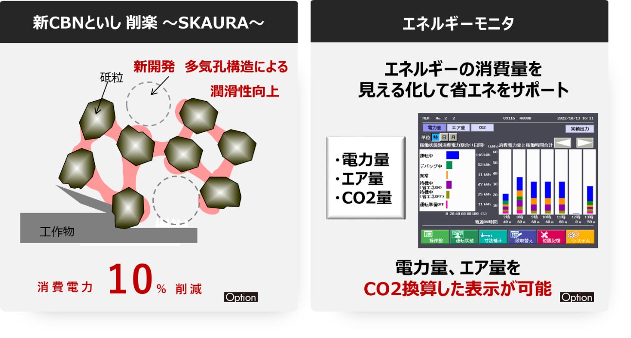 ジェイテクトのグループシナジーにより、CO2削減でお客様のカーボンニュートラルを貢献します。新たに開発したジェイテクトグラインディングツール製の多気孔構造を採用した新CBNといし「削楽」の搭載で、消費電力を従来比10%削減。また、エネルギーモニタで電力量、エア量およびCO2換算量を見える化し、お客様の省エネをサポートします。これらの消費電力削減効果により、CO2排出量を最大1t/年削減します。