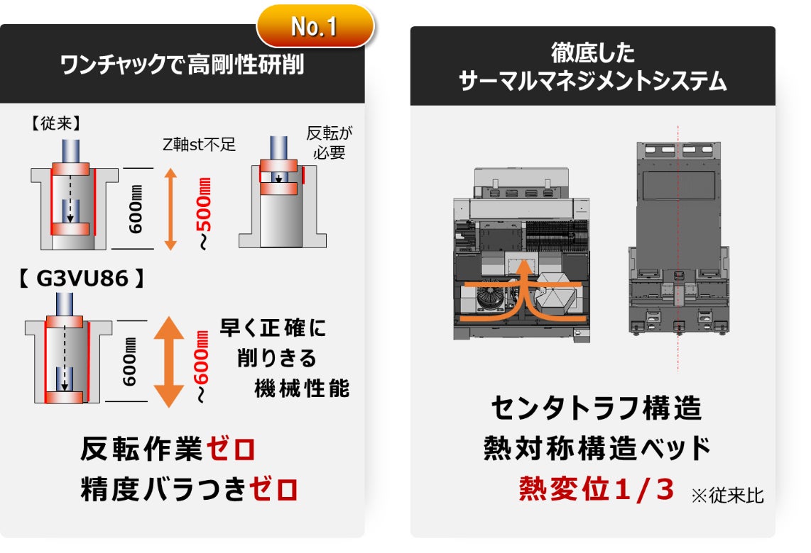 高い研削点剛性で、深さ最大600mmを早く正確に削りきることが可能となり、同仕様の工程においてはナンバーワンの性能です。そのため、工作物を反転レスでワンチャック研削でき、精度のバラつきが発生しません。また、クーラントや研削くずを加工点直下で回収するセンタトラフ構造、および熱対称構造ベッドによるサーマルマネジメントシステムで、熱変位を従来比1/3に抑え、寸法のばらつきを極限まで低減します。