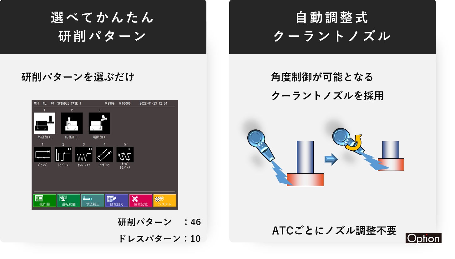 研削パターンをかんたんに選べる操作盤や、角度制御ができATCごとのノズル調整が不要な自動調整式クーラントノズルなど、充実した支援機能を搭載することで快適な段取り作業を実現します。