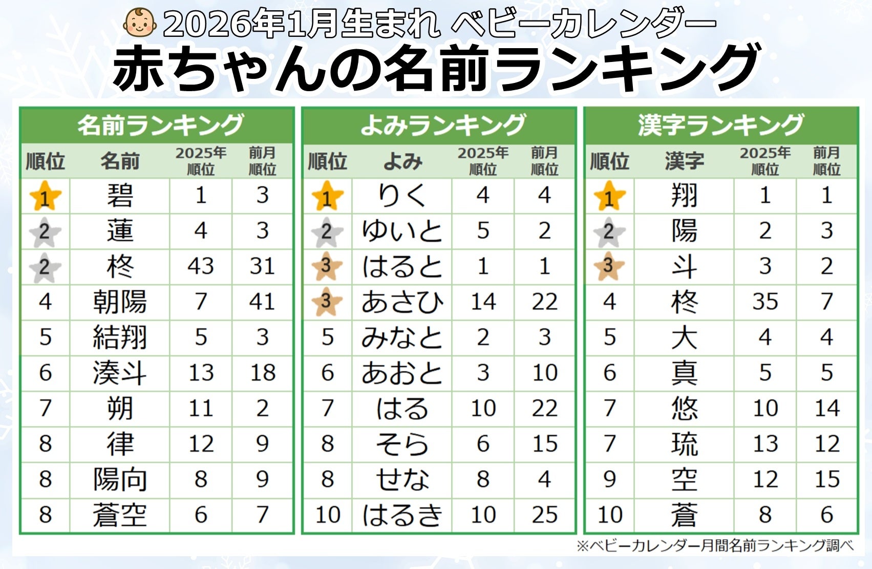 1月は、光をイメージさせるよみの上昇も見られました。「あかり」は2025年12月の29位から1月は7位へ、「ひかり」と「とうか」は12月の100位から1月は37位へと大きく順位を伸ばしています。暗さの中にやさしく差し込む光を思わせるこれらのよみは、新しい一年の始まりに希望を託す名前として選ばれたと考えられます。明るさやあたたかさを感じさせる響きが、冬生まれの名付けと相性のよさを見せています。
