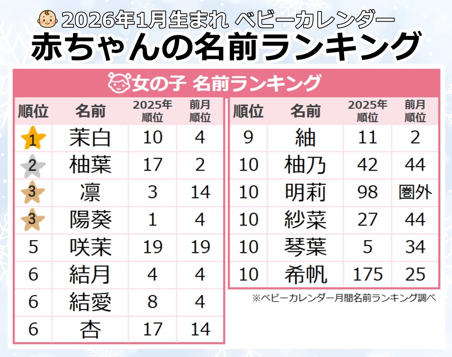 2025年12月は4位だった「茉白」が、2026年1月には首位を獲得しました。「ましろ」という響きは真っ白な冬の雪景色や澄んだ空気を思い起こさせます。今季最強・最長寒波が襲来した1月、厳しい寒さとともに広がる雪景色のイメージと重なり、注目を集めた名前と言えそうです。真っ白な雪のような純粋さや清潔感は、新しい年のスタートにふさわしいイメージとも重なり、1月生まれの女の子の名付けで多く選ばれました。