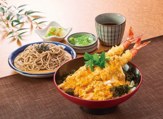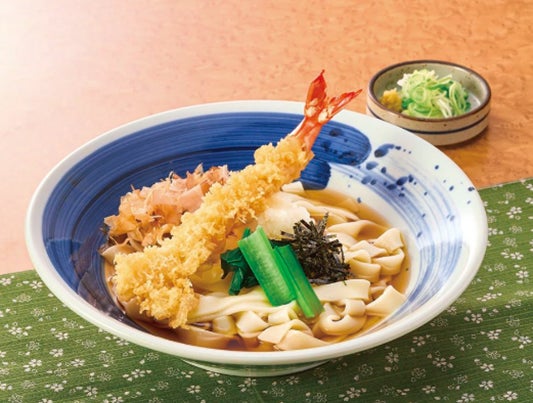 暑い季節にぴったりの、名古屋名物「きしめん」に、サガミ自慢の大海老天とさっぱりとした大根おろしが、食欲をそそるメニューです。店内製麺のそばにも変更できます。