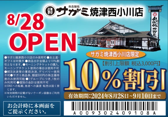 また、サガミ焼津西小川店限定でご利用いただける割引券を記載いたしました。この画面を掲示で期間中、何度でもご利用いただけます。
