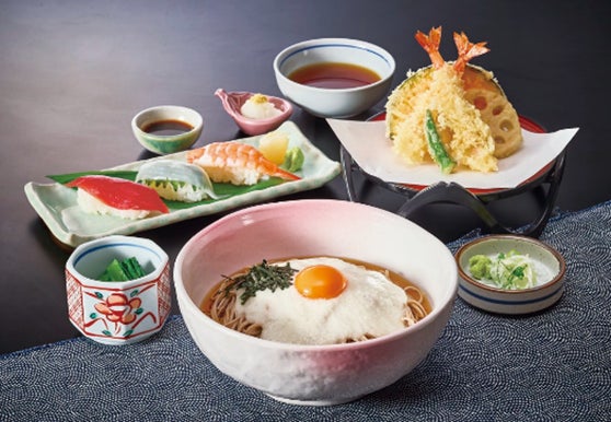とろろそばは、厳選素材の大和芋を使用した、香り・味・粘りにこだわったサガミ自慢のとろろと、店内製麺のそばが絡み、滑らかな食感と深い旨味が特徴の逸品です。寿司と天ぷら、小鉢がついたお得なセットメニューです。