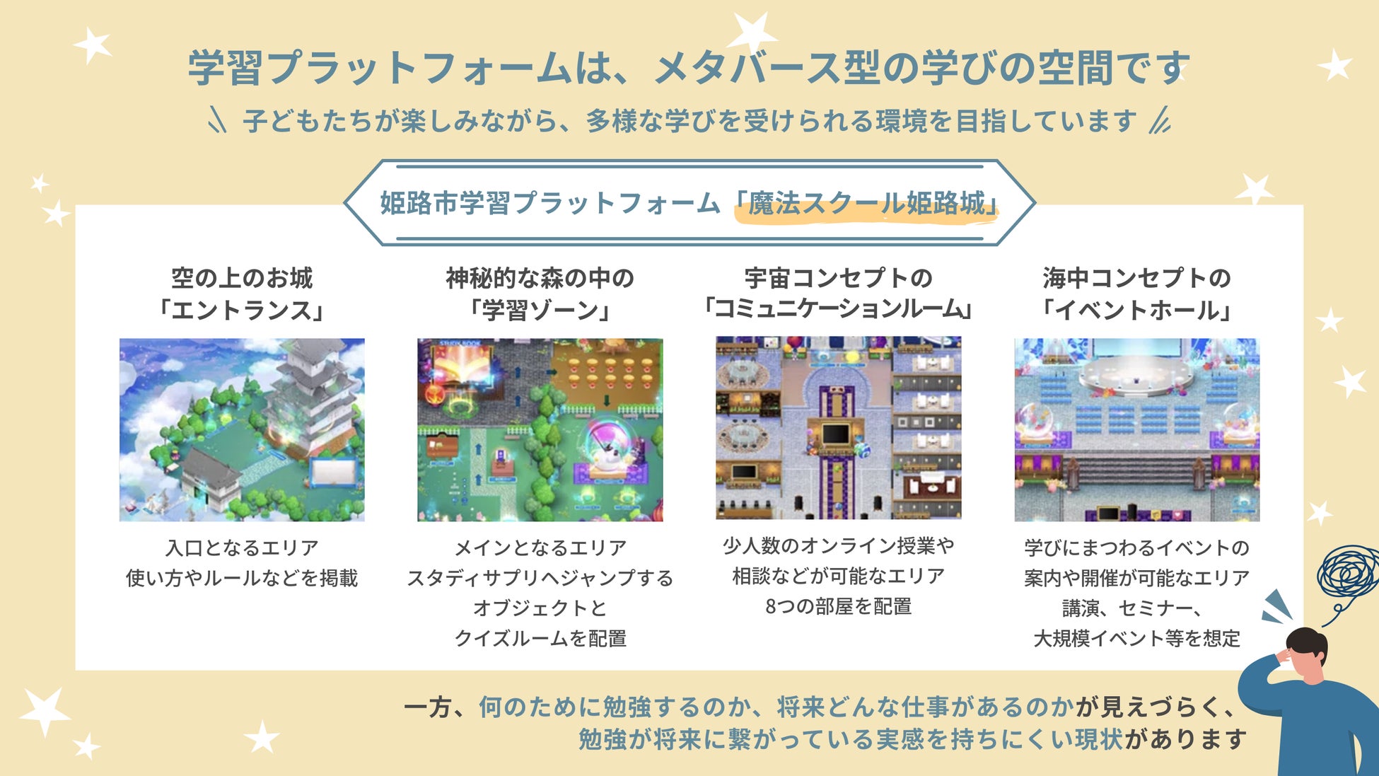 姫路市では、子どもたちが自分らしく学び、将来の夢やキャリアにつなげられるよう、 2Dメタバースを活用した学習プラットフォーム「魔法スクール姫路城」を2025年1月からスタートしました。 このサイトでは、GIGAスクール端末などからアクセスし、動画教材やデジタルドリルなどを使って学ぶことができます。