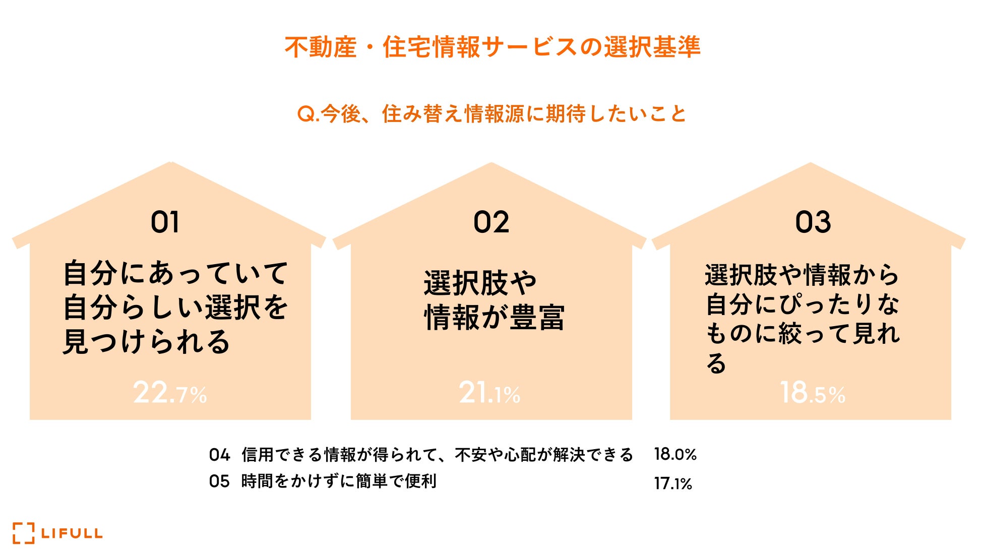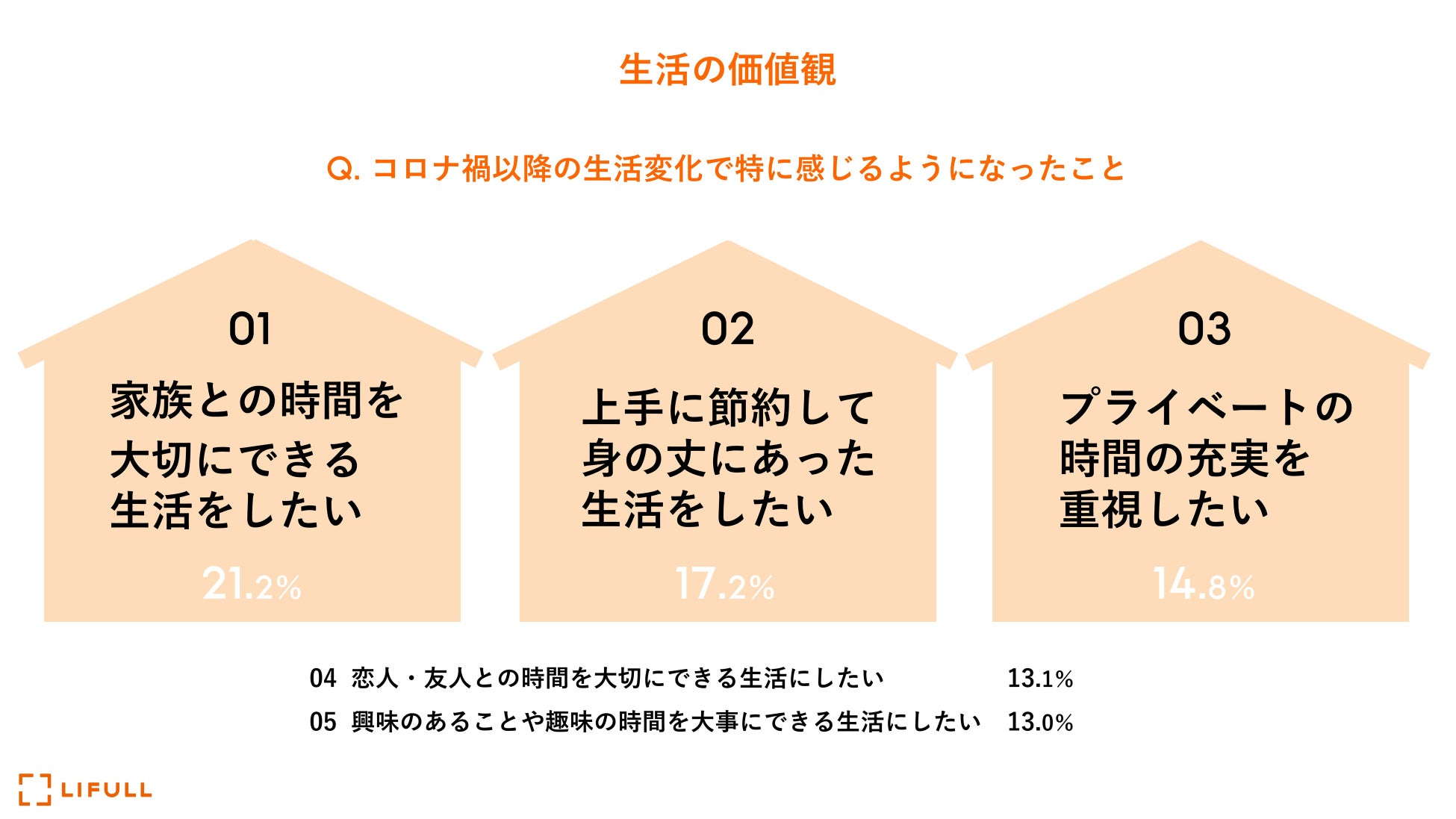 昨年2022年にLIFULLが実施した調査(※)では新型コロナウイルスの感染拡大以降、特に感じるようになった生活価値観の変化のトップ3は、「家族との時間を大切にしたい(21.2%)」「節約して身の丈にあった生活をしたい(17.2%)」「プライベートの時間の充実を重視したい(14.8%)」であり、また不動産・住宅情報サービスに今後期待することとしてより「自分にあっている選択が見つけられる(22.7%)」ことが1位に上がっています。