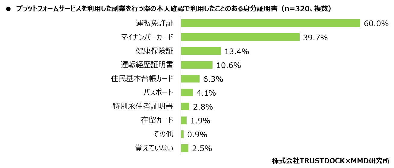 次に、プラットフォームサービスを利用した副業の際に本人確認を行ったと回答した320人を対象に、本人確認に利用したことのある身分証明書を聞いたところ(複数回答可)、「運転免許証」が60.0%と最も多く、次いで「マイナンバーカード」が39.7%、「健康保険証」が13.4%となった。