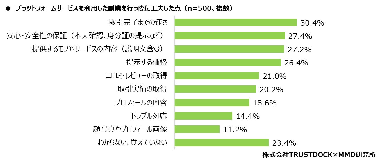 プラットフォームサービスを利用した副業をメインで行ったことがあると回答した500人を対象に、工夫した点を聞いたところ(複数回答可)、「取引完了までの速さ」が30.4%と最も多く、次いで「安心・安全性の保証(本人確認、身分証の提示など)」が27.4%、「提供するモノやサービスの内容(説明文含む)」が27.2%となった。