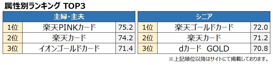 また部門別ランキングでは、属性別「主婦・主夫」で【楽天PINKカード】と【楽天カード】が、同じく属性別「シニア」で【楽天ゴールドカード】と【楽天カード】が、それぞれ1位、2位を独占しています。