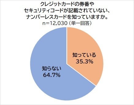 そこで今回の調査対象者に「券番やセキュリティコードの記載のない、ナンバーレスカードを知っているか」聴取したところ、35.3%が「知っている」と回答。現状の認知は3割を上回りました(2021年10月調査時点)。