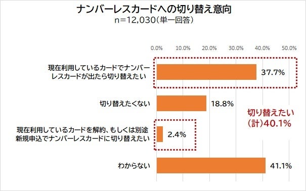 ◼ 新形態“ナンバーレスカード”認知率は35.3% 今後「切り替えたい」40.1%