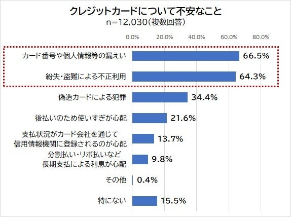 ◼ クレジットカードで不安なことは「カード番号や個人情報等の漏えい」が最多 66.5%