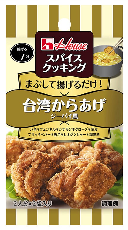 ハウス食品は、メニュー専用シーズニング「スパイスクッキング」シリーズの新アイテム2種、<台湾からあげ ジーパイ風><さっぱりたたききゅうり>を、2月14日からスーパーなどで発売します。台湾屋台で人気のトレンドメニューと家庭で使用頻度の高い素材である“きゅうり”で作るアイテムです。2人分×2袋入り。オープン価格 (税別参考小売価格110円)。