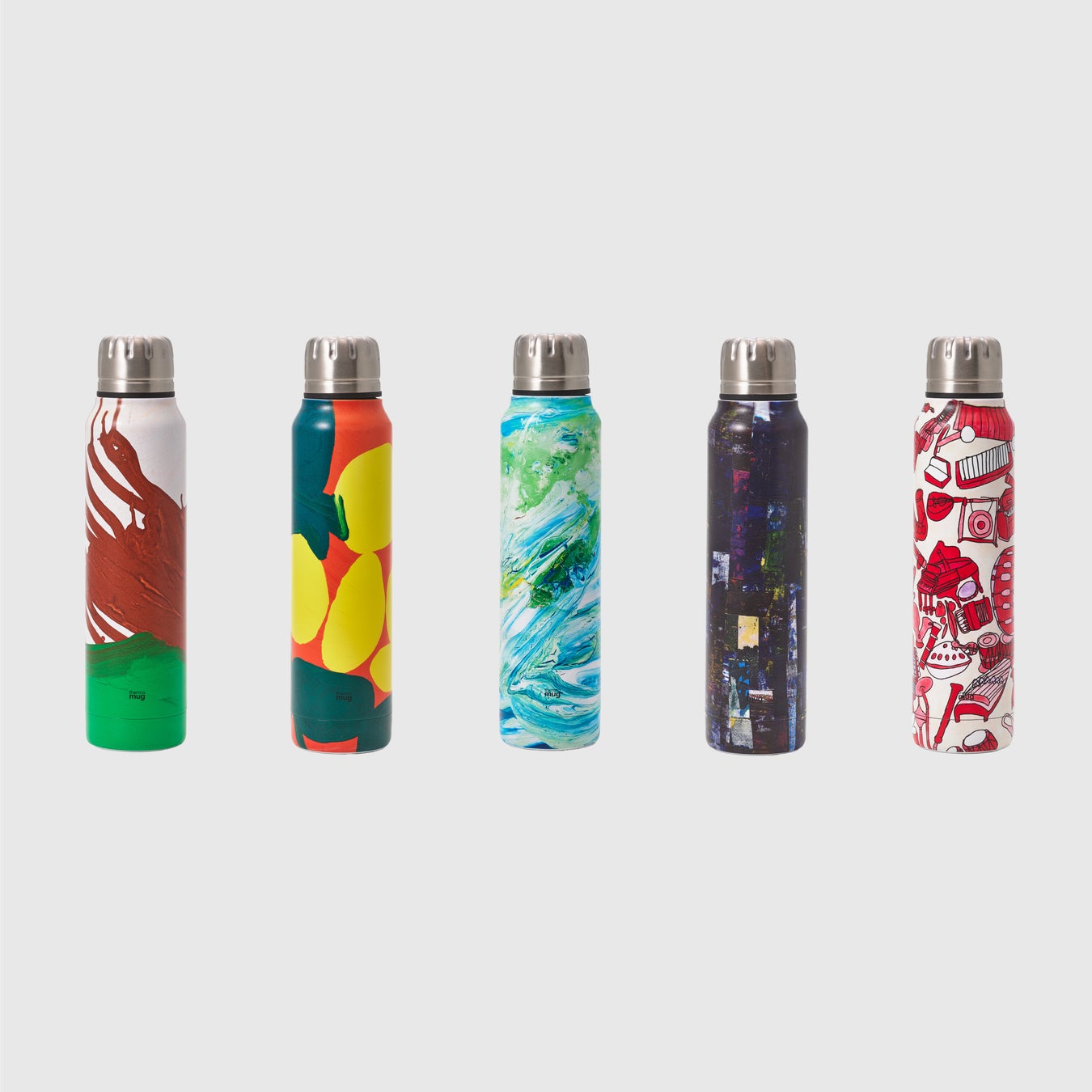 5種類のアートがあしらわれた水筒。アウトドアや職場でのワンポイントアイテムにも。