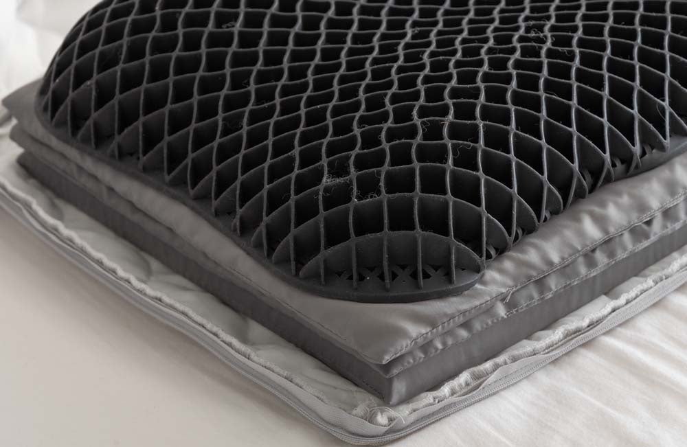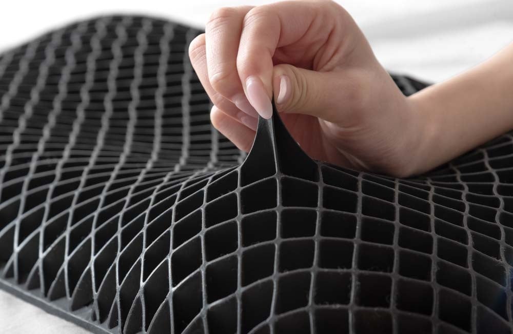 中材には、高い伸縮性と弾力で、もっちりと包み込まれるような寝心地を生み出すTPE素材(熱可塑性エラストマー)を採用しています。TPE素材はゴムのように自在に形を変えるため、どんな寝姿勢でもしっかりとフィットし、快適な睡眠をサポートします。さらに、形状にもこだわり、中心部をなだらかにくぼませることで、頭から首元までしっかり密着しやすい構造にしています。