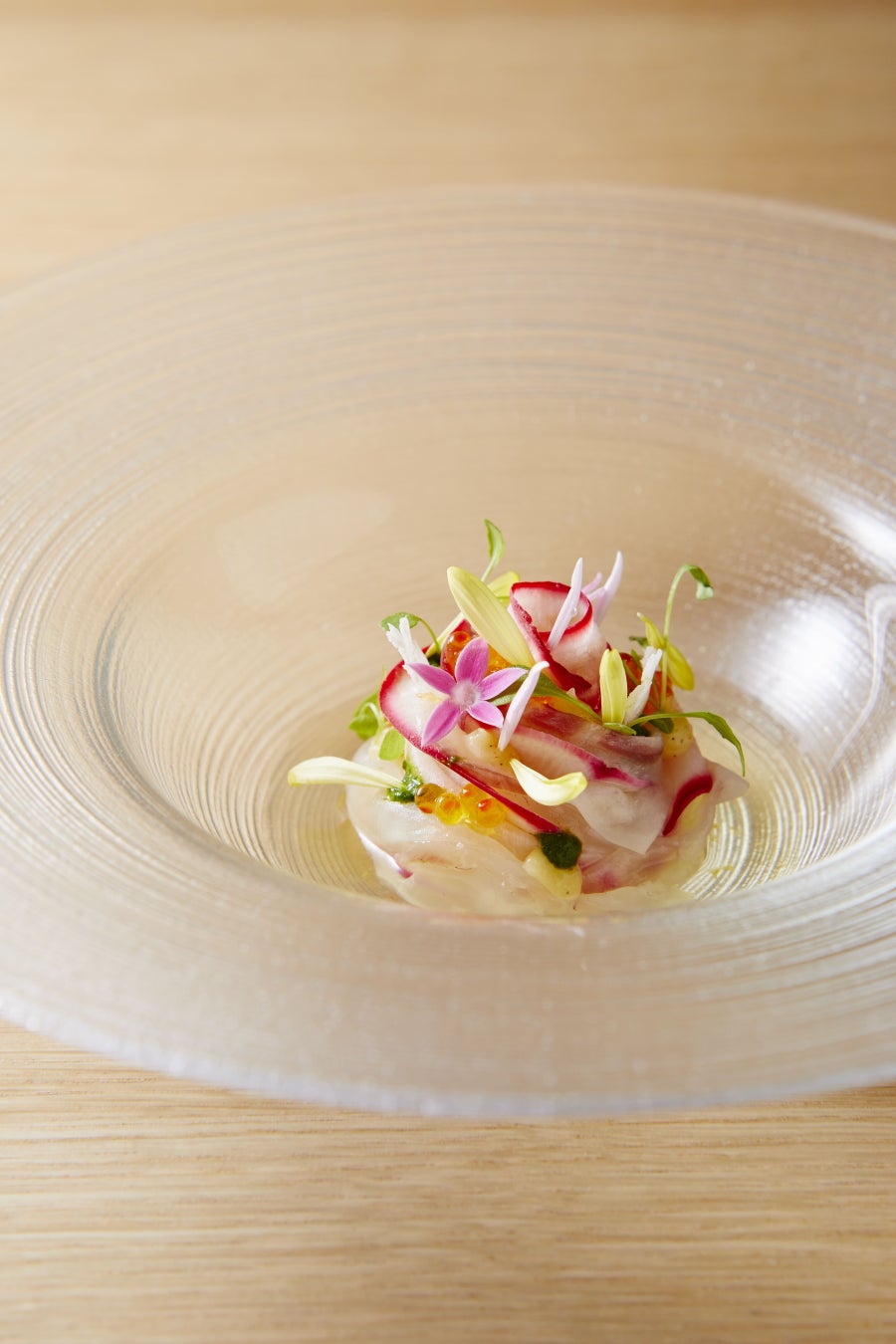 花に見立てた“紀州梅まだい” じゃばらの出汁とコンフィチュール ロケットピューレ \2,000