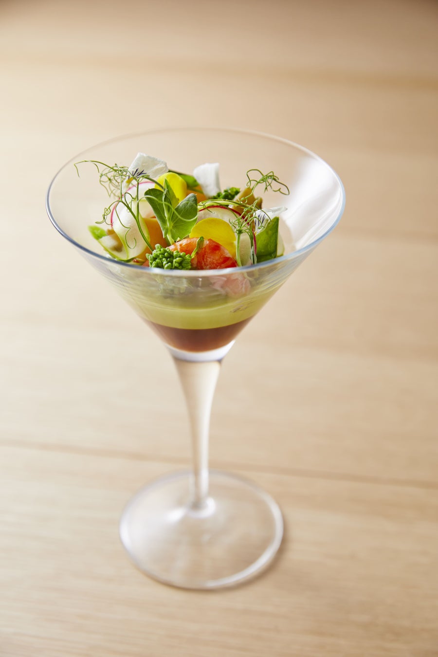 和歌山県産アシアカエビと紀和味アワビのカクテル 春野菜のクリーム \3,200